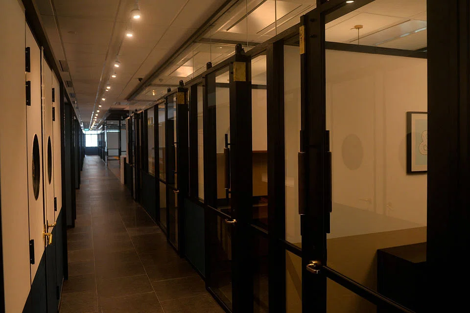 Then there are the Dedicated Offices, designed for teams of two to 20. Ms Ang says that such offices are good for those who still want to be near Raffles Place, but not experience the typical stuffy, corporate feel. These rooms can be booked for a minimum three-month period. These offices come with timber desks, leather task chairs, storage shelves with brass detailing, flattering lighting and good fengshui.