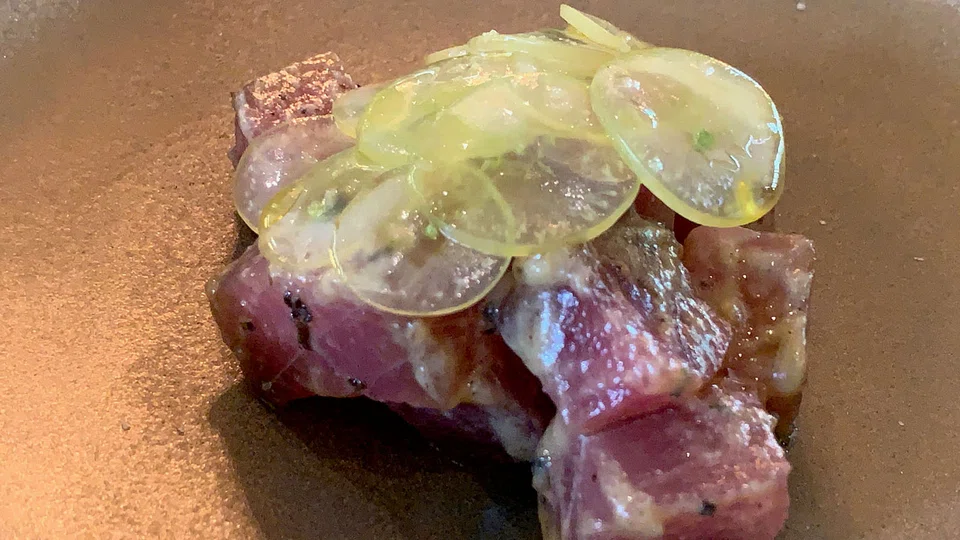 Tuna tartare (S$26) isn't the namby-pamby minced delicate sashimi that is the norm. Here, you get to sink your teeth into meaty chunks of tuna aged in kombu and marinated in soya sauce and mirin. Finely sliced grapes on top add a sweet distraction to this simple pleasure. In between the sharing plates, nibble on freshly popped corn (not the stale kind that stick to your teeth like a bad reputation) flavoured with pork fat and salt to negate any calorie savings. If you're feeling righteous, don't ask for a refill.