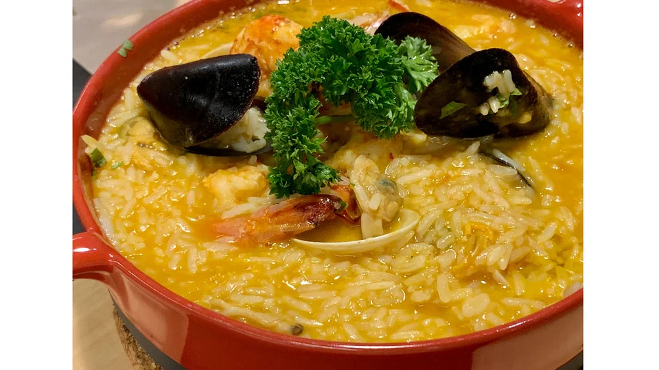 Arroz de marisco (S$49) is a paella that fell in love with a seafood bisque and started a new life in Asia. Tender rather than risotto-like, the rice grains hold their own in an intense, saffron-hued briny broth that steals the thunder from the borderline mushy shrimp and ho-hum mussels. But they're a minor infringement of a rib-sticking Portuguese mui fan.