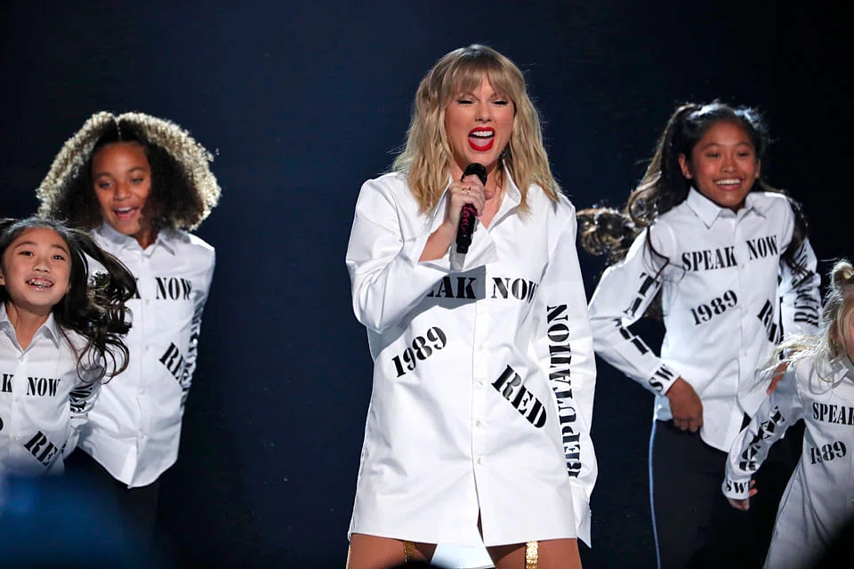 But on Sunday, the Fearless singer made no mention of the dispute, although she opened her performance wearing a white shirt printed with the titles of her old albums.