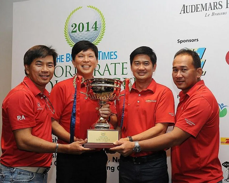 Winners in 2012 and 2013, the team collected 110 stableford points in the final round (the round's highest) on Sentosa's Serapong Course on Wednesday for a total of 534 (a total of five rounds out of six). They took home the coveted Business Times Corporate Golf League trophy in addition to other attractive prizes.