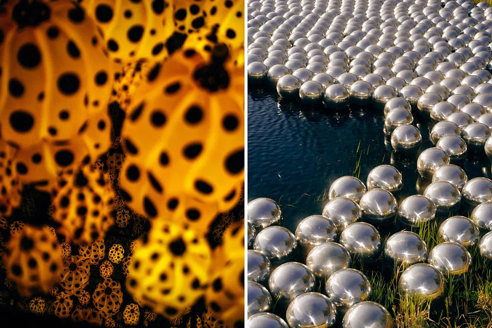 It's also the feeling I associate with the work of 92-year-old pop and conceptual artist Yayoi Kusama, best known for her infinity mirrors, her paintings and sculptures crowded with polka dots - and for the hordes of fans she typically draws. Luckily, starting last weekend, you can dive into the vertiginous delights of dots and infinite reflection at Kusama: Cosmic Nature, an expansive show of outdoor sculptures, along with special gallery exhibits and installations, set among the flowering cherry trees of the New York Botanical Garden.