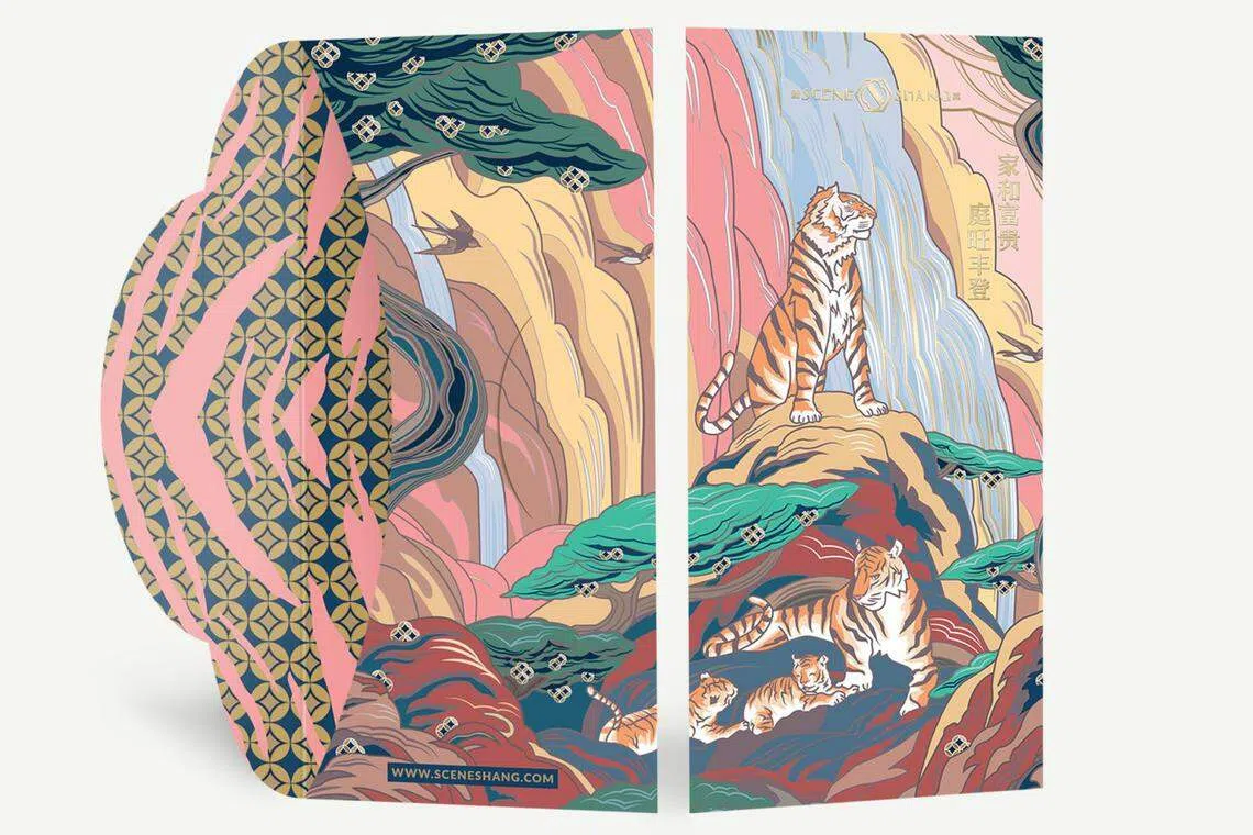 Each year, lifestyle brand Scene Shang goes for a modern take on the traditional red packet. This time, they have drawn inspiration from the tiger and its auspicious symbolism. "The Tiger speaks of strength, courageously taking on the day to bring peace and prosperity into our homes," says co-founder Pamela Ting, of the family of tigers on a mountain.