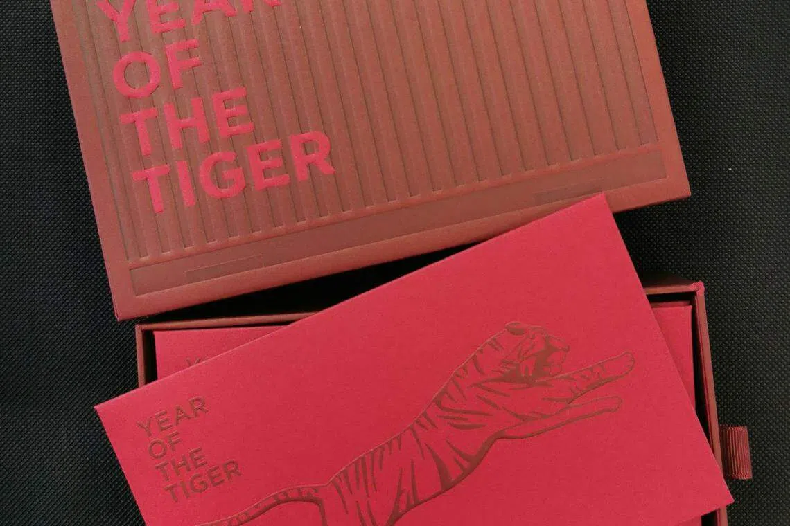 A powerful image of a leaping tiger adorns luxury watch brand IWC's red packets made out of sustainable FSC paper which comes from responsibly managed forests. They come in a solid ridged paper box that resembles a shipping container like what was used in its Big Pilot global campaign. You'll see the same tiger reflected in the flagship store's window display too, welcoming Chinese New Year with a mighty roar.