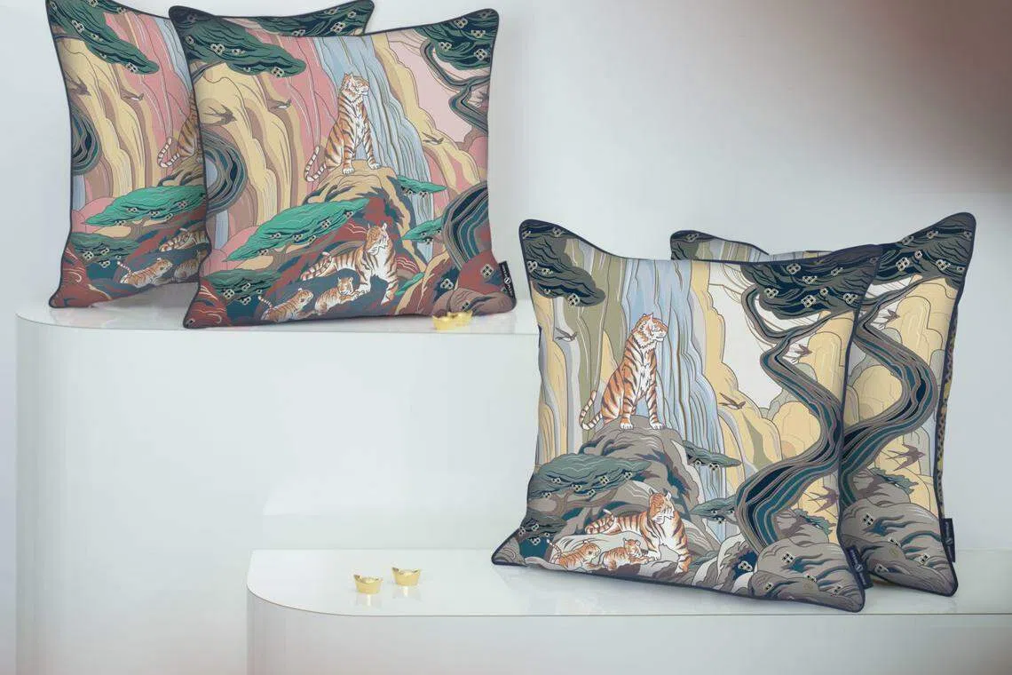 Dress up the sofa with these satin cushions. A family of tigers gathers on a mountain top amidst lush greenery, symbolising harmony and vitality. Auspicious red clay and gold coins adorn the cliff while the waterfall nearby represents wealth. Available in plum blossom pink or emperor yellow.