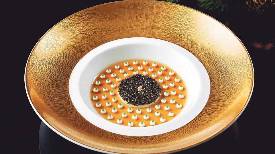 Leading the pack are Kim Joinie-Maurin and Vianney Massot, head chefs of Joël Robuchon Restaurant and L'Atelier de Joël Robuchon respectively. At the three-Michelin-starred Joël Robuchon Restaurant, Chef Joinie-Maurin presents signatures such as shaved black truffle and potatoes topped with foie gras carpaccio; pan-seared scallop with pumpkin cream and crispy chestnuts; and beef chateaubriand with foie gras, "Rossini" style, soufflé potatoes and port reduction. Available on Christmas Eve and Christmas Day, an eight-course menu is available at S$588 per person. On New Year's Eve, the eight-course menu is priced at S$508.