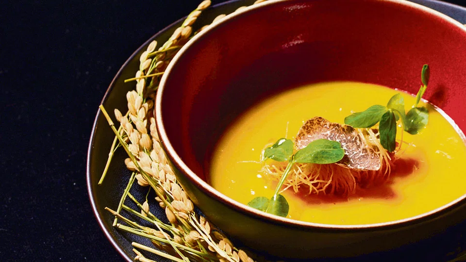 50g John Dory (or any fish with white flesh) Kadaif noodle Truffle oil Baby leaves Method FOR THE SOUP 1 Peel the butternut squash, and dice it into 2mm squares. 2 Dice the onions into 3mm squares. 3 Put the butter and the onions together in the pot, and stir-fry on low heat for 27 minutes. 4 When the onions become yellowish, add the butternut squash and stir-fry on low heat until it is cooked. 5 When the butternut squash is cooked, turn off the heat and close the lid and rest for 20 minutes. 6 After resting, add milk and chicken stock; blend it in the blender. 7 Put the above over the hob and season with salt. Simmer and add cream, season with salt again. FRIED JOHN DORY 8 Put some salt on the fish and wrap it with kadaif noodle 9 Deep-fry the fish in 180ºC oil. PLATING 10 Put butternut squash soup in a bowl, and place fried John Dory on top, and spray a little amount of truffle oil. Garnish with baby leaves.