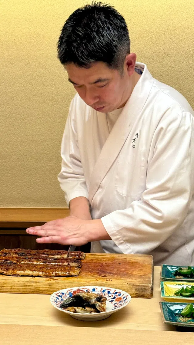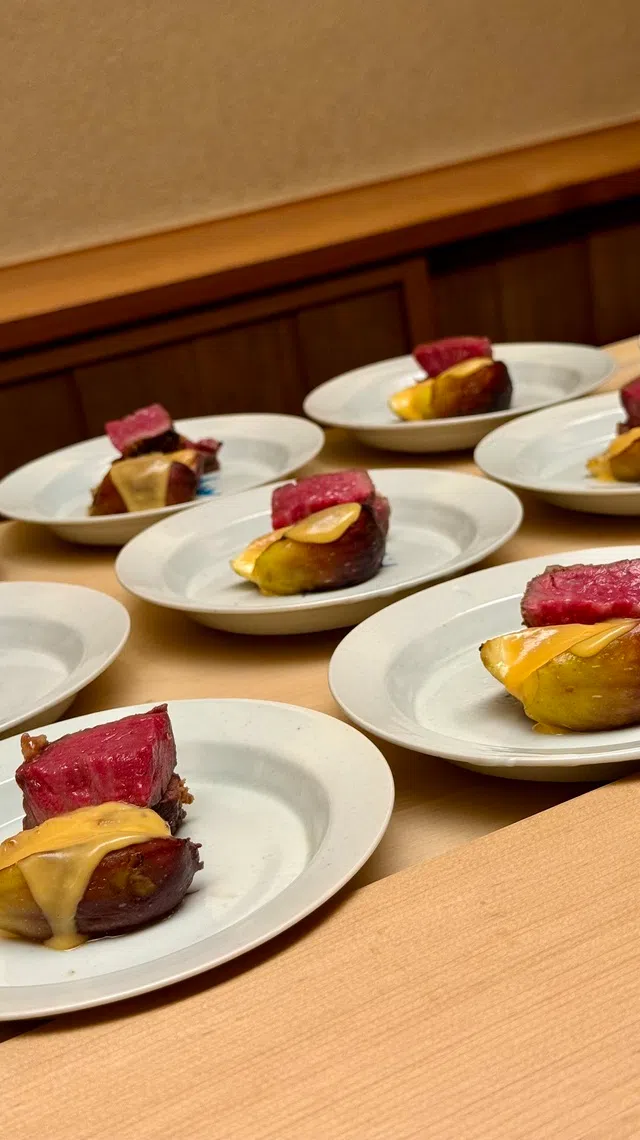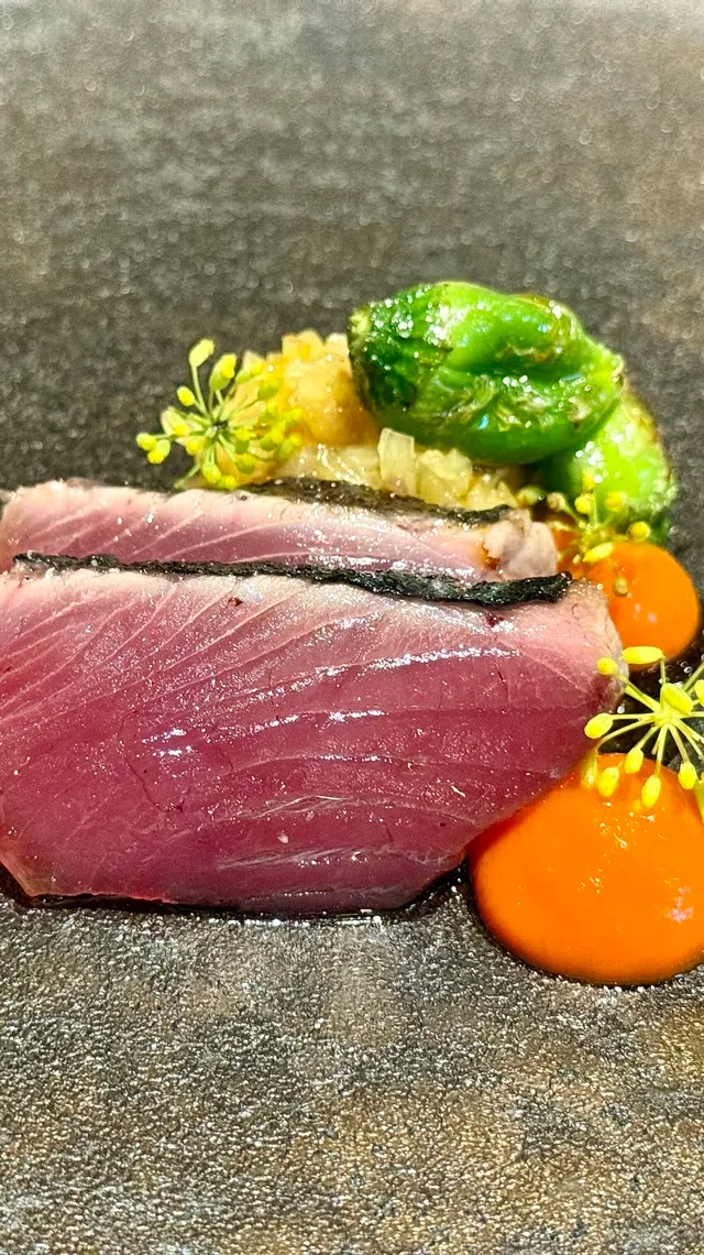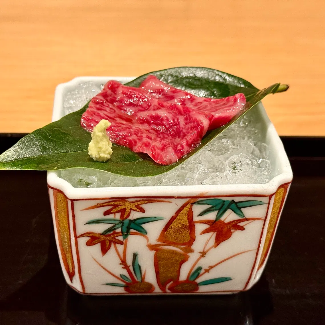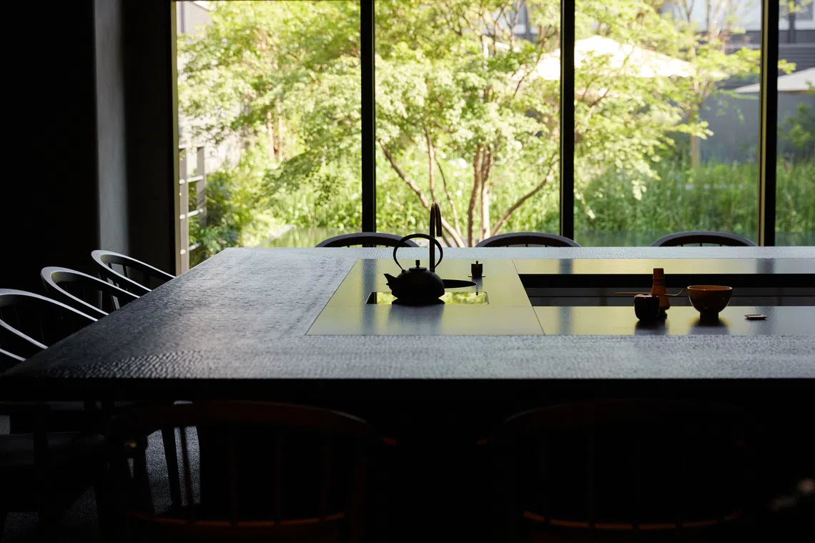 This is where he prepares a full line-up of seasonal ingredients highlighted by ayu – river fish native to Kyoto – speared and grilled over charcoal, served with a traditional takezu or herb sauce, and eaten whole from head to tail. Also impressive is wagyu marinated in miso, which he scrapes off and grills, paired with melting soft fresh figs.