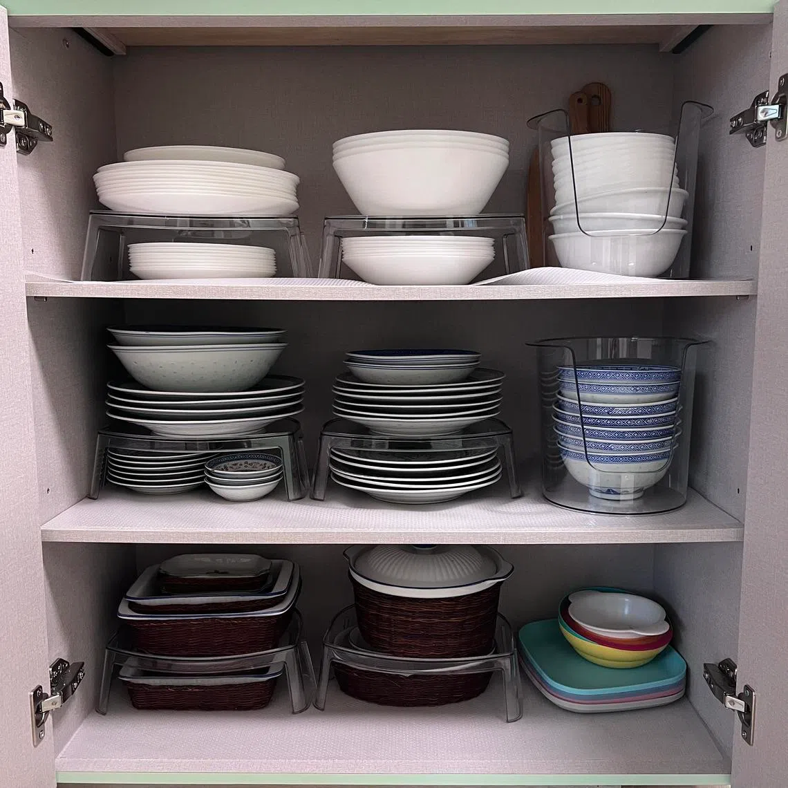 When sorting items quickly by category, containers are helpful and more visibly pleasing. Clear ones also help you remember what you have for easy retrieval and avoid repeat purchases. “Everything in the same category should be kept together – like in a shop,” advises Chew.