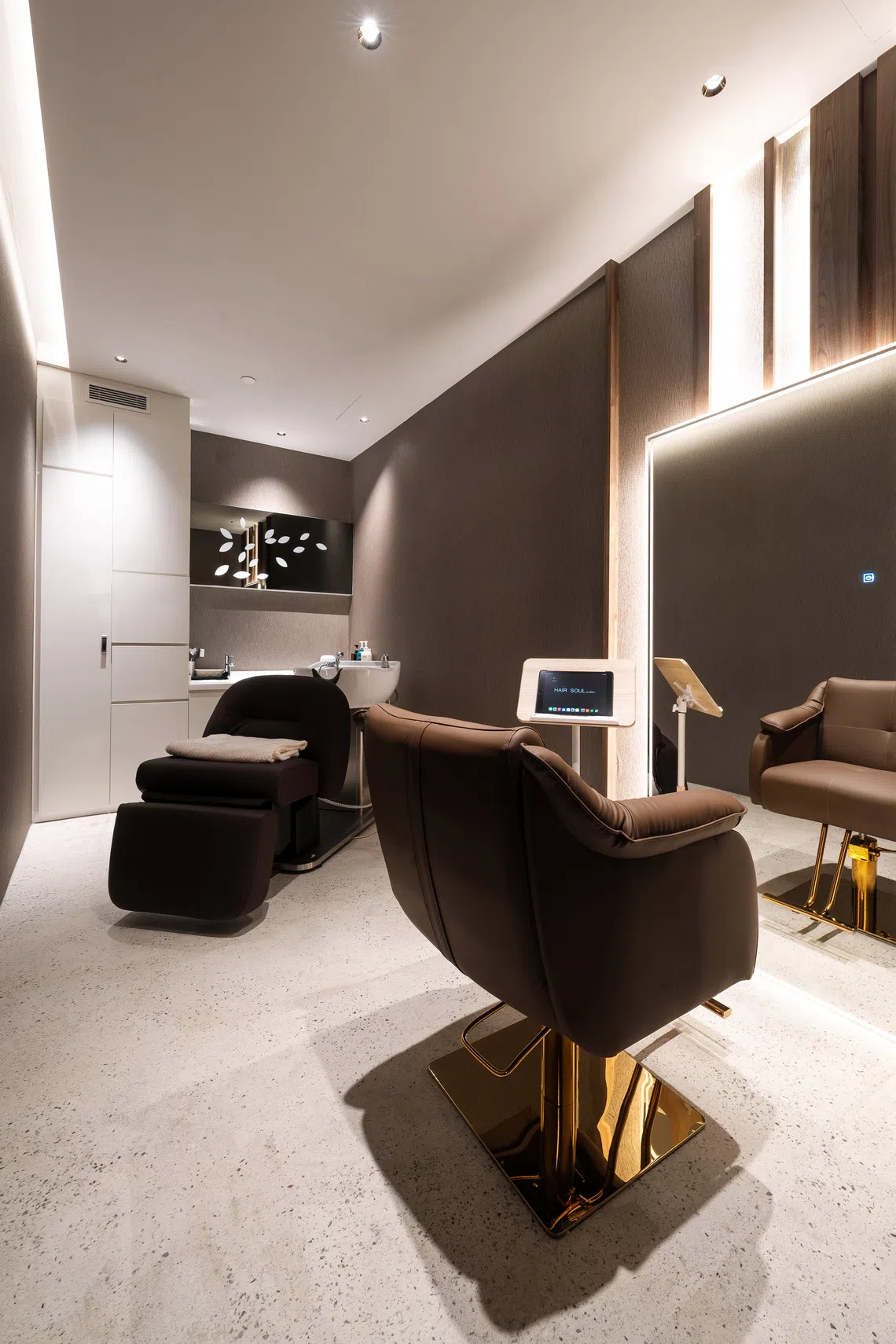 Sited within SENZE Boutique Spa, the two private hair suites thoughtfully designed by Wee offer a luxurious, exclusive space for clients to enjoy hair services in complete privacy. The emphasis is on scalp health as the foundation for great hair design and styling, with 100 per cent pure water also used for scalp treatments and vegan-based products for hair health.