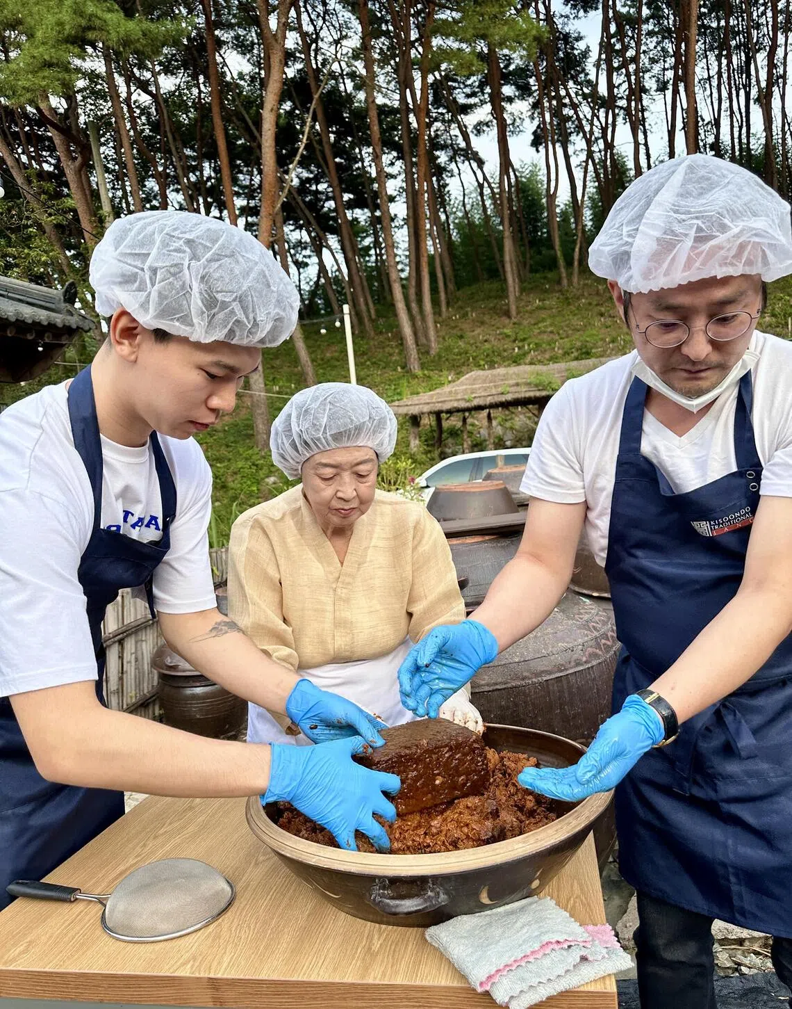 Out on the field, where the jars of sauce lay in different stages of fermentation, chef Ryu’s grand “opening” of his personal soya sauce is overseen by the matriarch herself, as other family members help to peel off the backing that covers the jar.