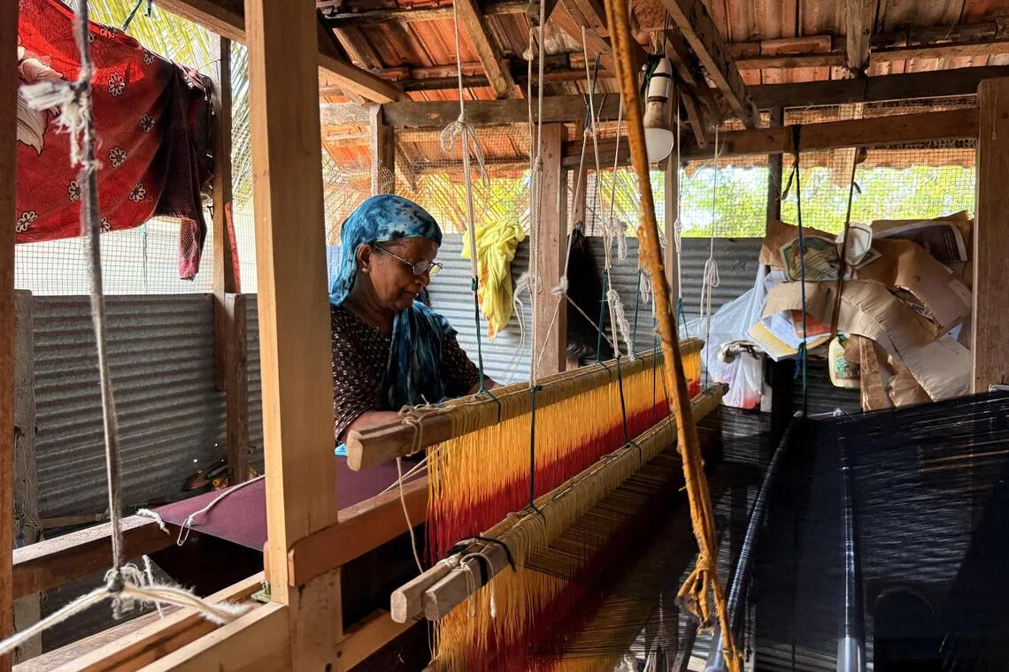 One day, Azhar takes us to Palamunai, a small village filled with families of home weavers, where we pile into the corrugated-iron home of Rubia, a self-taught artisan. As the sprightly 68-year-old clacks away with hands and feet on her wooden loom, thread turns into fine-woven fabric, and we see the beginnings of a sarong emerge.