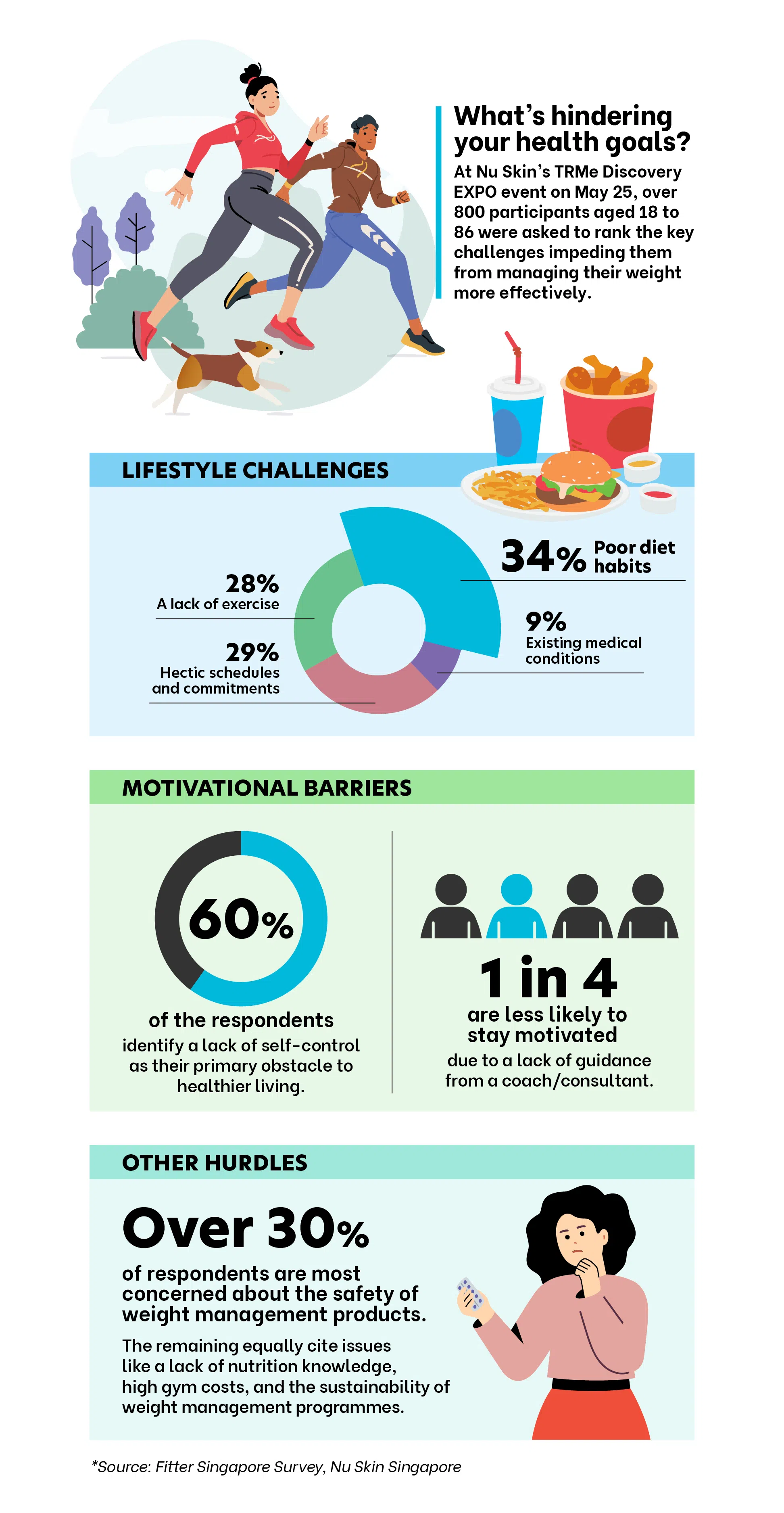 In fact, poor dietary habits are cited as a key obstacle to healthy weight management. This is according to a recent lifestyle survey conducted by beauty and wellness company Nu Skin Singapore, where 77 per cent of respondents indicated dissatisfaction with their current weight and body shape.