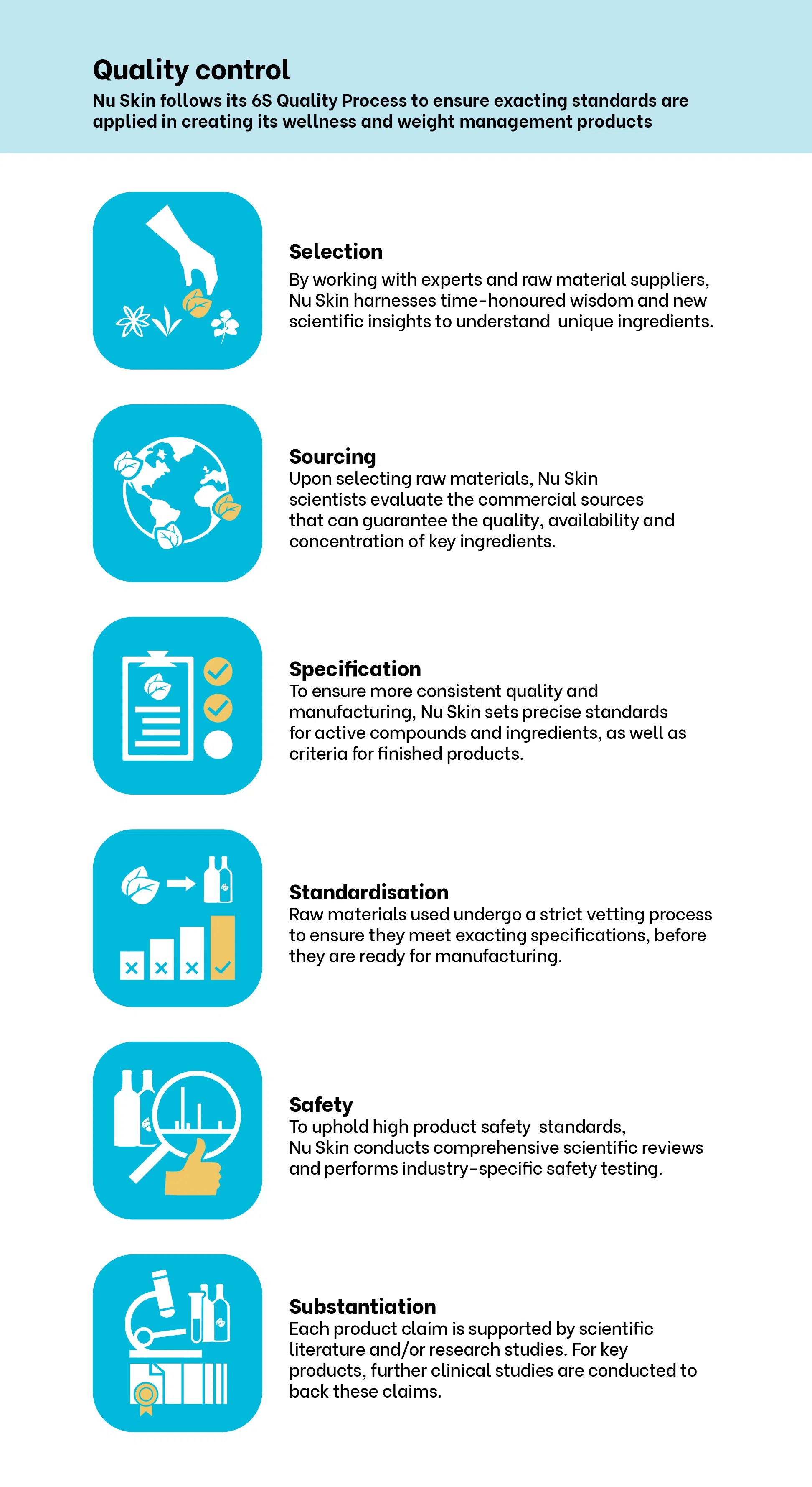 Says Joseph Chang, PhD, chairman of the Scientific Advisory Board at Nu Skin: “Amidst the growing supplement landscape, Nu Skin prioritises product safety, quality and efficacy through our rigorous 6S Quality Process. We meticulously select ingredients from trusted sources, rigorously test them, and substantiate our formulations with extensive research and clinical studies.