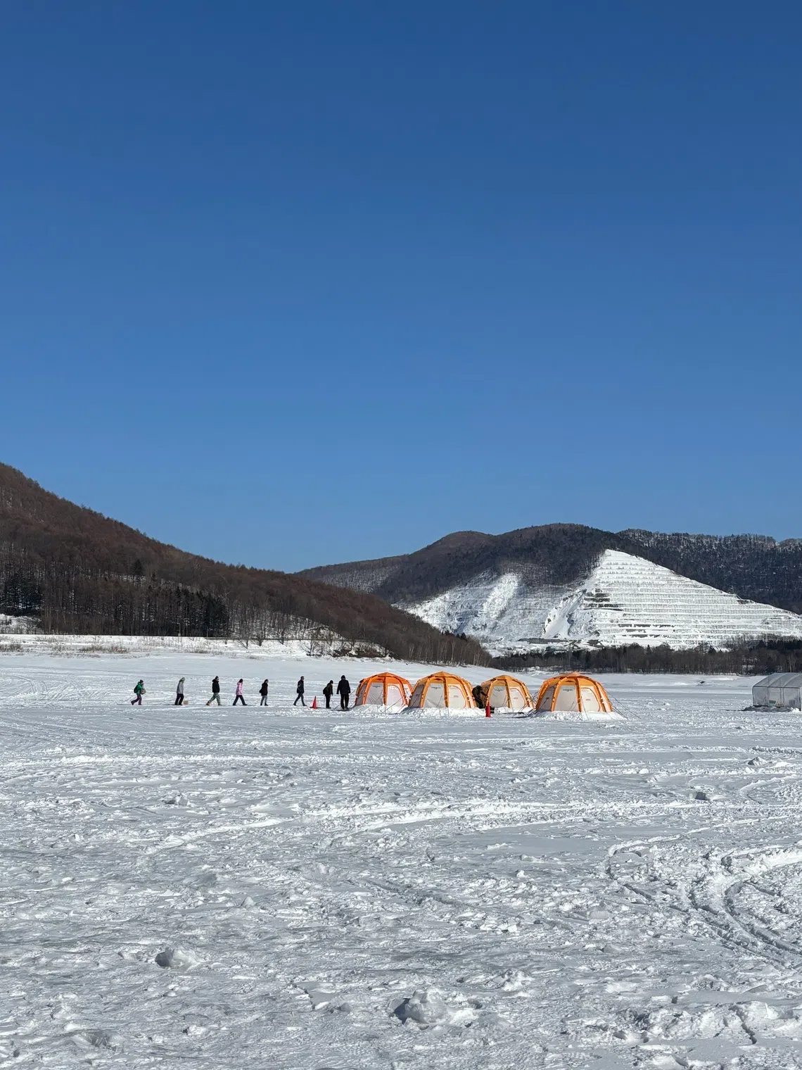 One morning, we head to Lake Kanayama for ice fishing – specifically for wakasagi, a species of smelt native to Hokkaido. Our guides lead us to the frozen lake and usher us into one of the heated tents. Seated on tiny stools, we lower our fishing lines through pre-drilled holes and patiently wait for a tug.