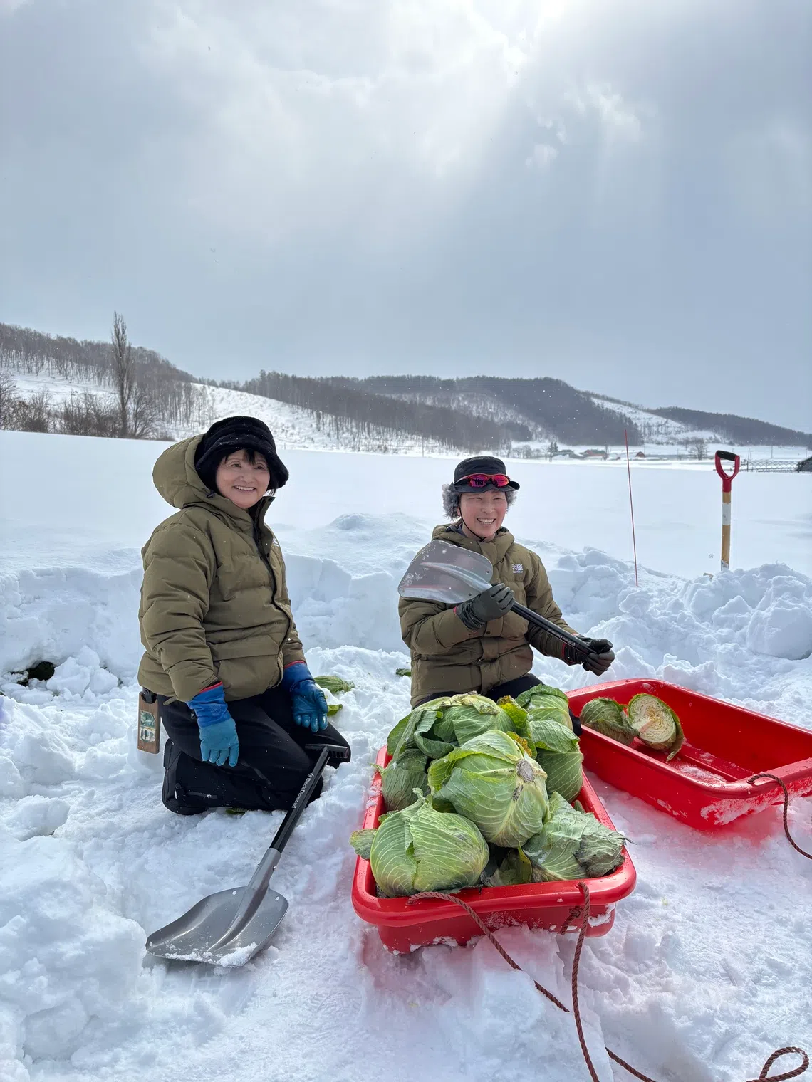 On another morning, we’re off to harvest cabbage. Part of Furano’s agricultural heritage, the leafy vegetables are buried beneath the snow to heighten their sweetness and preserve freshness. At the 100-year-old Endo farm, we’re given shovels to dig up the vegetables, which are then lugged to a tented area.