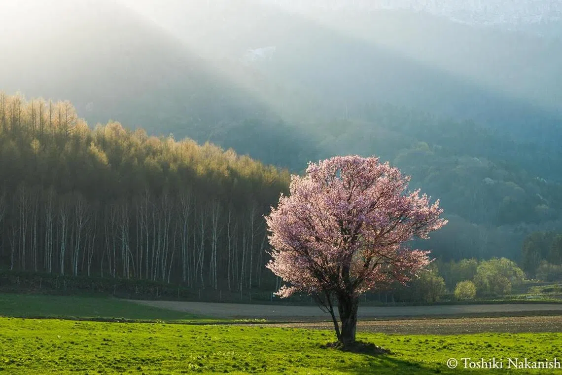 Kamigoryo in southern Furano is known for a solitary sakura tree standing in a vast field, waiting for its springtime bloom. The region happens to be one of the last places in Japan where the iconic flower blossoms – usually in early May.