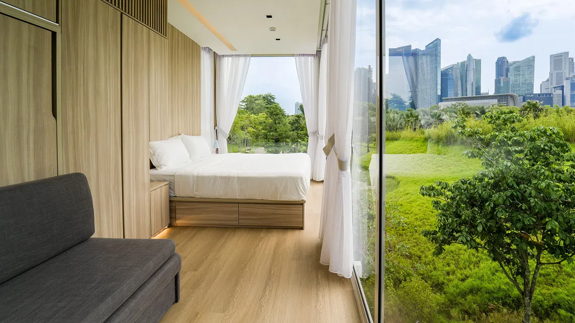 Repurposed from shipping containers, the fully air-conditioned pods are equipped with energy-efficient systems and can be relocated with minimal environmental impact. A standout feature is the outdoor deck, offering an idyllic space for guests to soak in the scenic beauty of Gardens by the Bay.