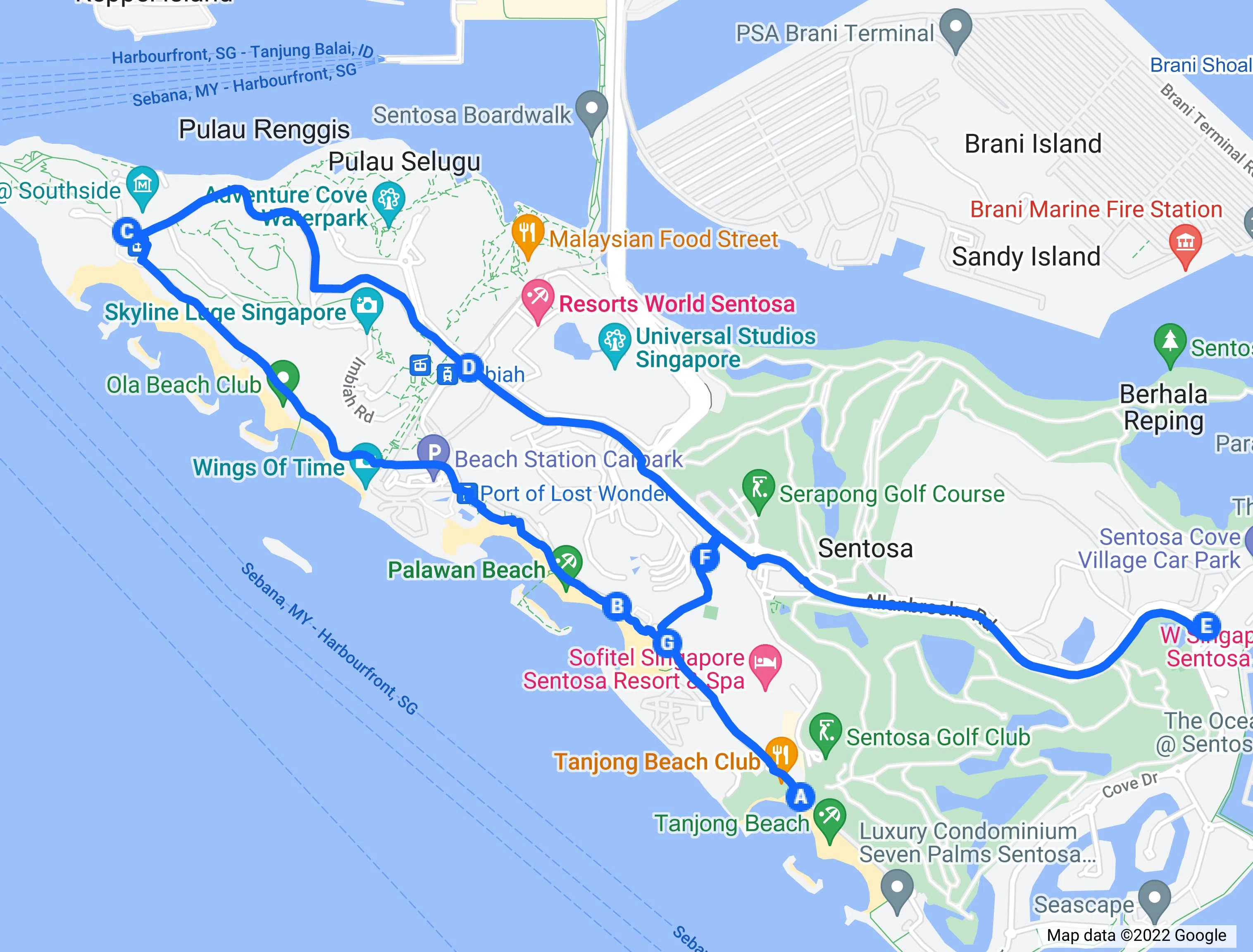 Route markers: (A) Start at Tanjong Beach (B) Palawan Beach (C) Siloso Point (D) Imbiah Station, continue along Artillery Ave (E) U-turn at Sentosa Cove, roundabout near 7-11 (F) Turn left onto Artillery Ave South (G) End at FOC Sentosa