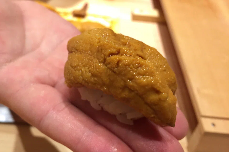 Kinmedai - usually lightly grilled or just served raw - is aged 10 days for a smooth, velvety texture. When he serves you toro, you notice very fine cuts on the fish - 40 to be exact - which he says breaks down the fibre and makes it melt in your mouth. It does. Japanese geoduck or mirugai is lightly grilled with a smidgen of sweet sauce, followed by lightly grilled fatty Nodokuro or black throat perch. And for the climax - an intensely rich, sweet Murusaki uni with just a vague bitterness that lends to the complexity of this delicacy that comes from Kyushu.