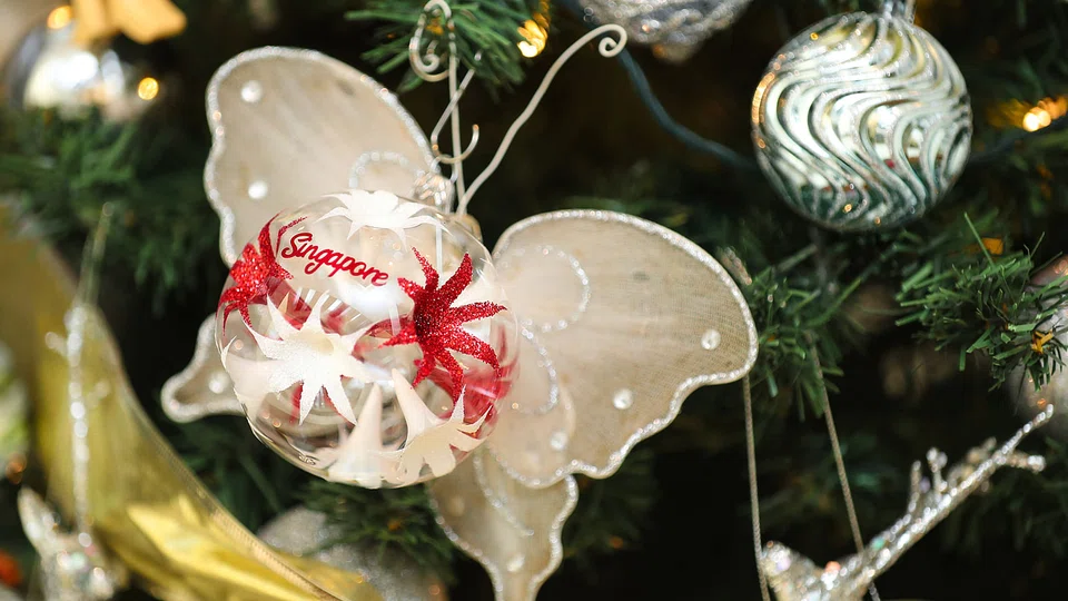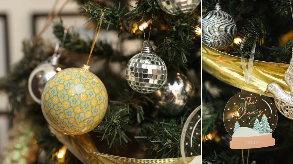 She points to a bauble decorated in a Peranakan print, and a red-and-white bauble with Singapore printed across it, both of which complement well with the overall gold and silver theme for the tree.