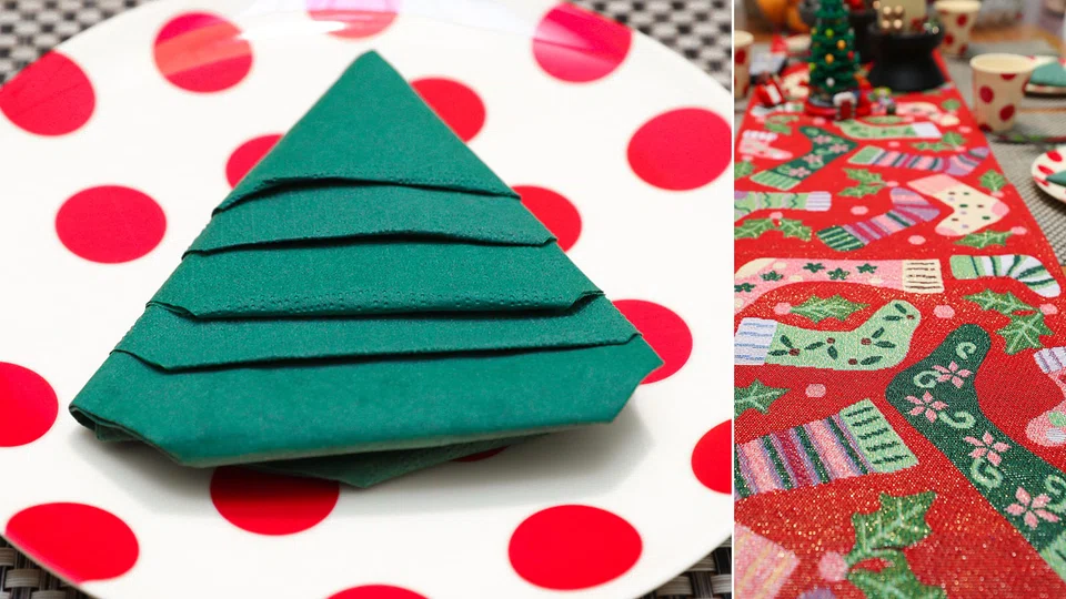 They made a centrepiece out of Lego pieces and folded Christmas trees out of recyclable napkins. The candles on the table are reusable electric ones and the kids also decorated the candle stand with leftover icing fondant from the Christmas cake.
