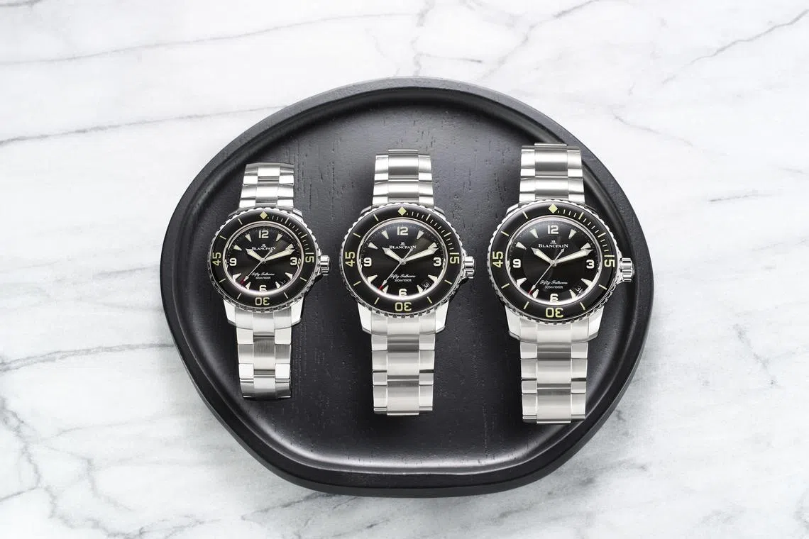 Available in polished steel, Grade 23 titanium or red gold, this smaller edition doesn’t compromise on gravitas. The new sunburst black and blue dials dance with light, while the shimmering mother‑of‑pearl variants (in black or pink) add subtle glamour. Every model features a domed sapphire bezel and oversized luminous markers, framed by Blancpain’s heritage-inspired unidirectional bezel.
