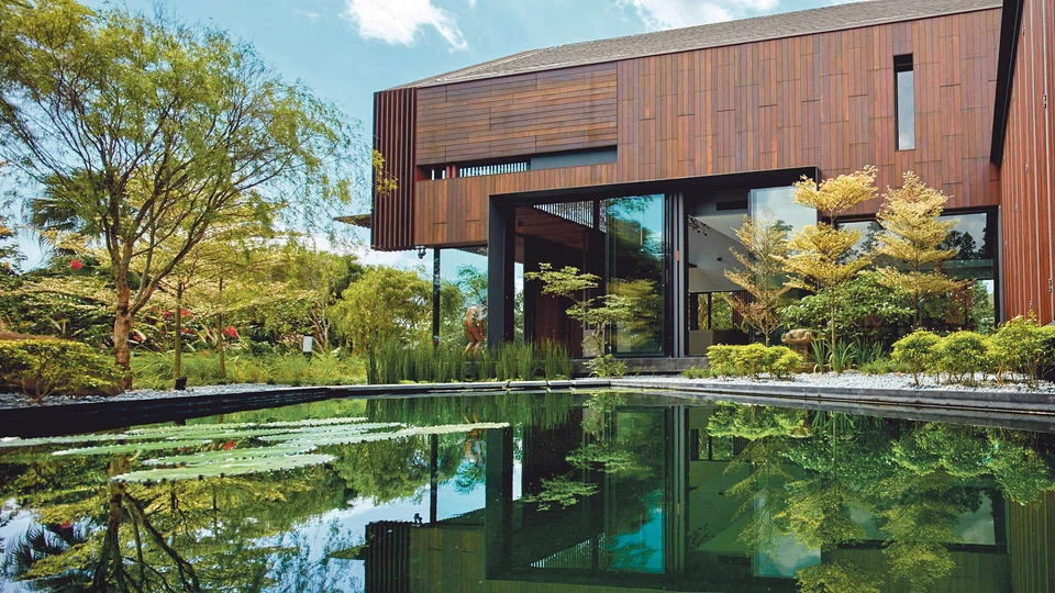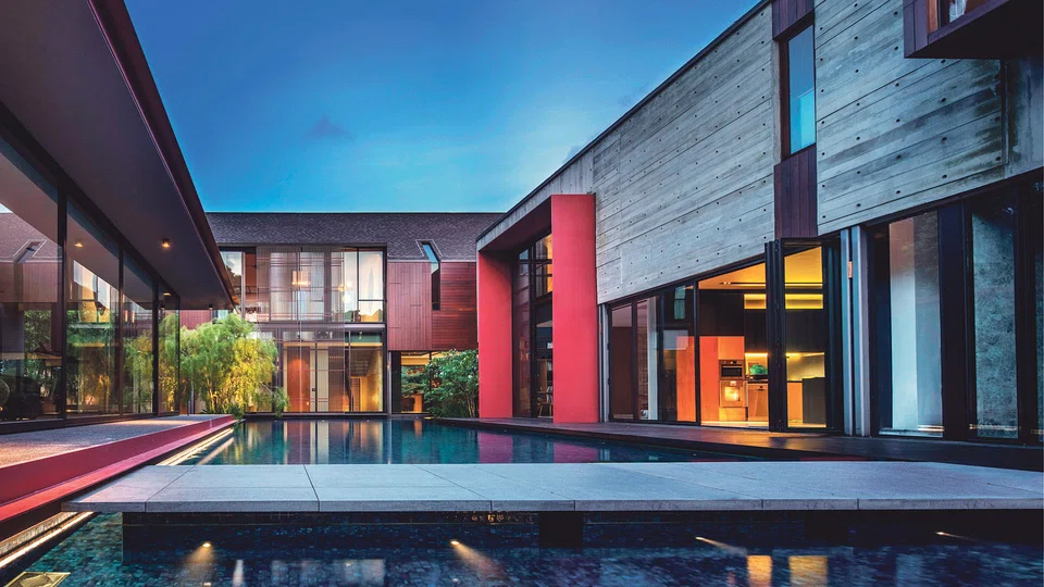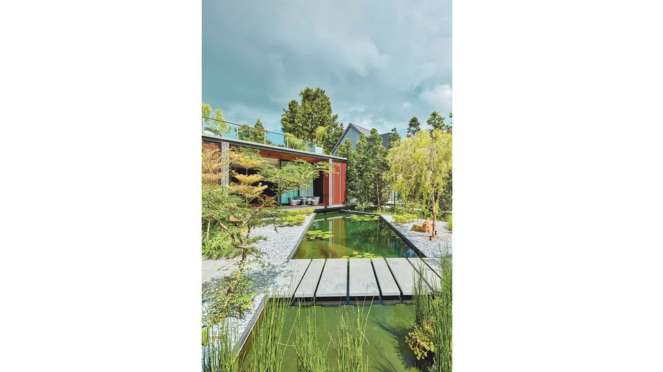 Call it house and gardens: there are three distinct green spaces around the building, including a tranquil Japanese garden fronting the owner's master bedroom on one side of the house, with one tip of the angled koi pond touching a discreet shaded veranda that extends from the bedroom. Then there is a small "secret garden" in front of the daughter's wing and mostly hidden from view, and finally a "water" garden, so called because it complements the swimming pool and gym at the rear of the house. "With some projects, we think of architecture first but this is a blend of two important disciplines," says Mr Keng.