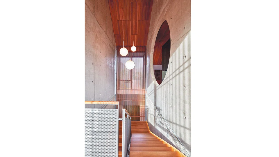The owners were also sufficiently open-minded to allow the use of non-typical materials and finishes in some areas. There's extensive use of fair-faced concrete for both exterior and interior walls, kitchen cabinets are finished in natural plywood and an electrical conduit beside a raw metal staircase has been left deliberately exposed.