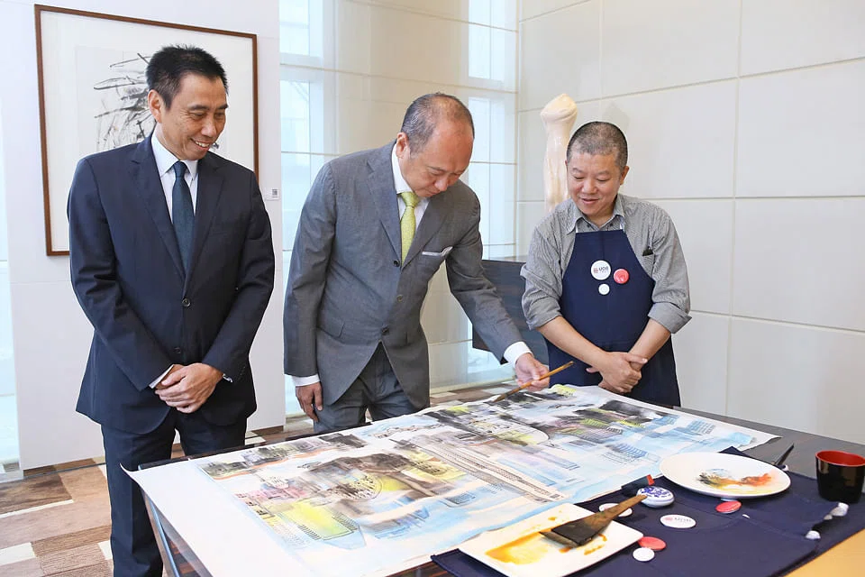 Contemporary Chinese brush ink and a traditional rice paper canvas were used for the 1.5 metre-by-one metre painting, which depicts the embankment between the Singapore River and Boat Quay, the area where Singapore's economic growth took root. Proceeds from the auction will be donated to the BT Budding Artists Fund and Sage Counselling Centre. The BT Budding Artists Fund supports underprivileged children with artistic talent while the Sage Counselling Centre combines expressive art therapy with its intervention work with the elderly.