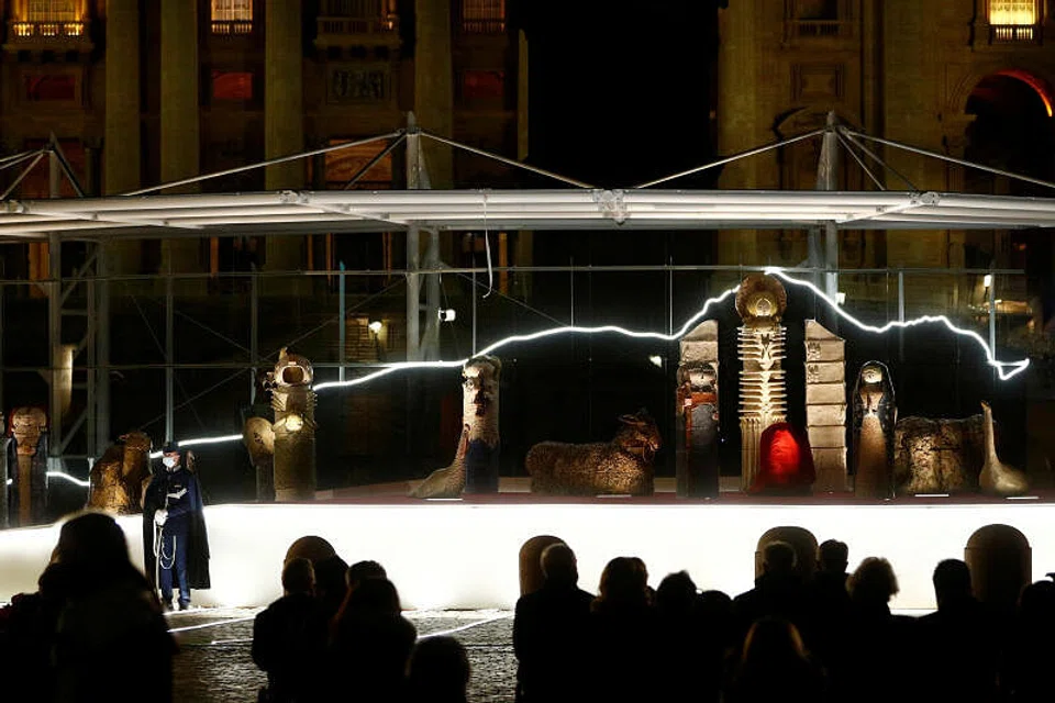 Past Vatican nativity scenes have included a broken boat representing the plight of refugees and a person visiting an inmate in a jail cell, symbolising charity. Last year's was sculpted from 720 tons of beach sand.