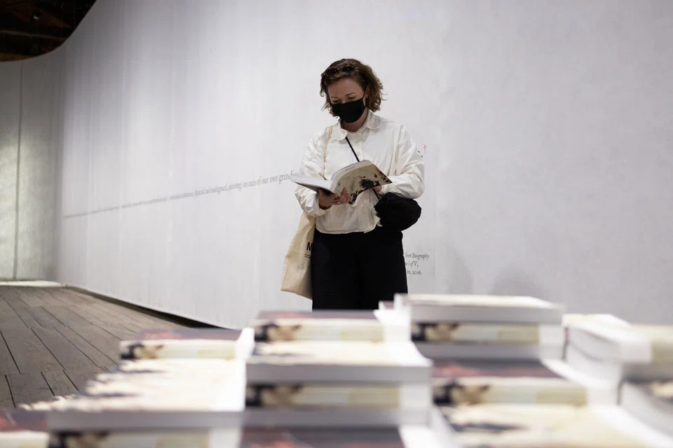 Further into the maze, there is a small structure made out of books. You're invited to take a free copy of Pulp III: An Intimate Inventory Of The Banished Book (2022), and sit on one of benches to browse the 400-page tome, which recounts the history of Singapore and Venice as once-formidable printing hubs, and other stories about publishing.
