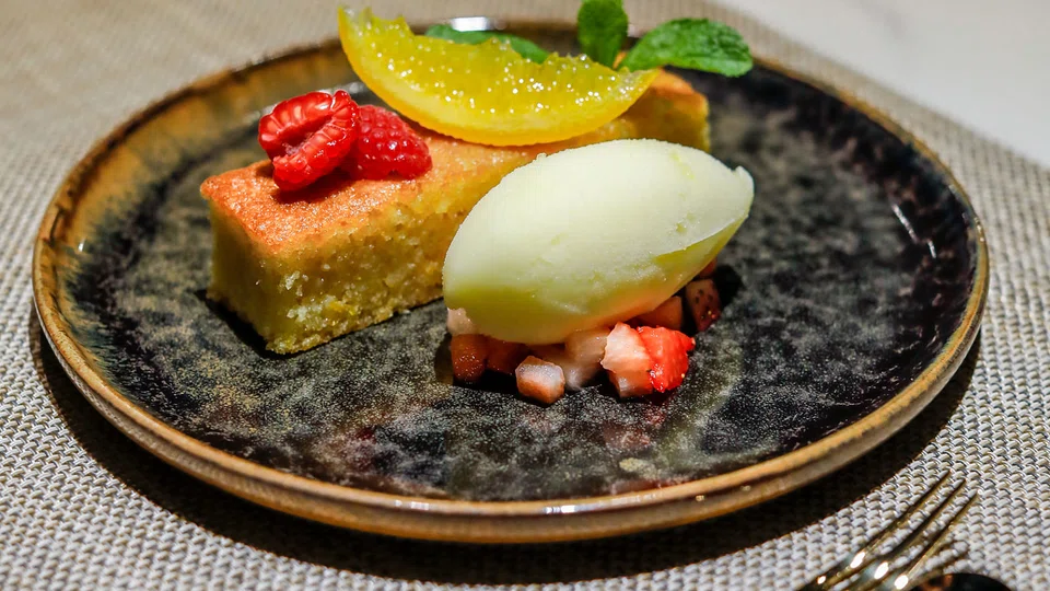 Dessert is pleasing enough - a home-style orange-infused butter cake with yuzu sorbet (S$12.80) and an apple tart with crisp edges and custardy filling (S$12.80) with mediocre vanilla ice cream.