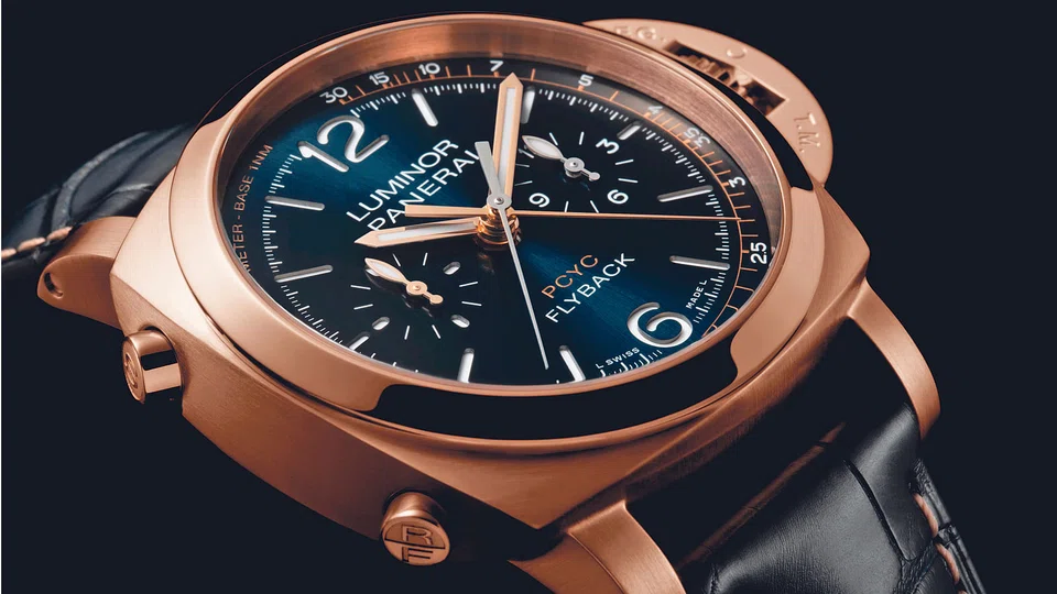 This comes in three new flyback chronographs inspired by the beauty of classic yachts. Yachts are a tribute to the world's long association with the sea and Panerai, which sponsors the Panerai Classic Yachts Challenge race. "PCYC" is inscribed on the three watches, which come in a titanium, matt black ceramic or gold 44mm case with the familiar Panerai crown-protecting device. The chronographs are equipped with a Panerai in-house automatic movement (P.9100) with a power reserve of three days. They also have a seconds reset mechanism, a speed calculator expressed in knots on the tachymeter scale and a rapid hour adjustment device. The three timepieces are distinguished by the colour combination of the dial and strap, which differ according to the case material. But all their dials are blue, the colour of the sea.