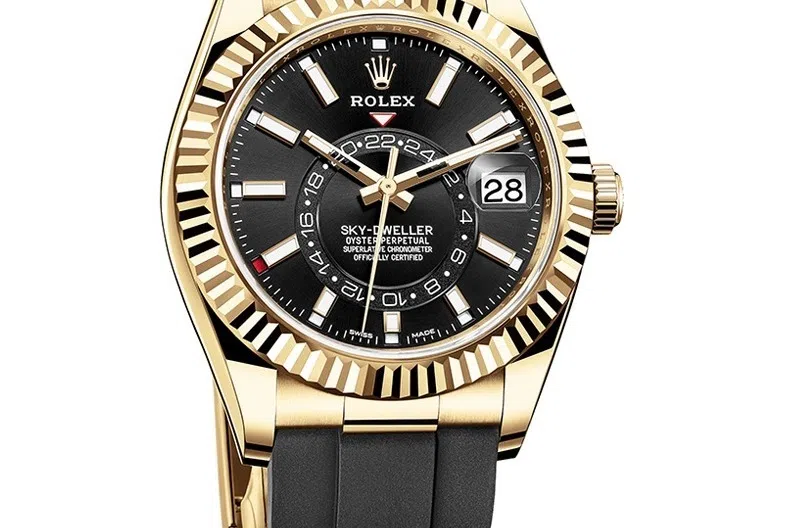 That same elastomer strap is also used on select gold Rolex Daytona and Yacht-Master models; and it not only gives the Sky-Dweller a dressier look but it also makes the watch lighter compared to when it's paired with a gold bracelet.