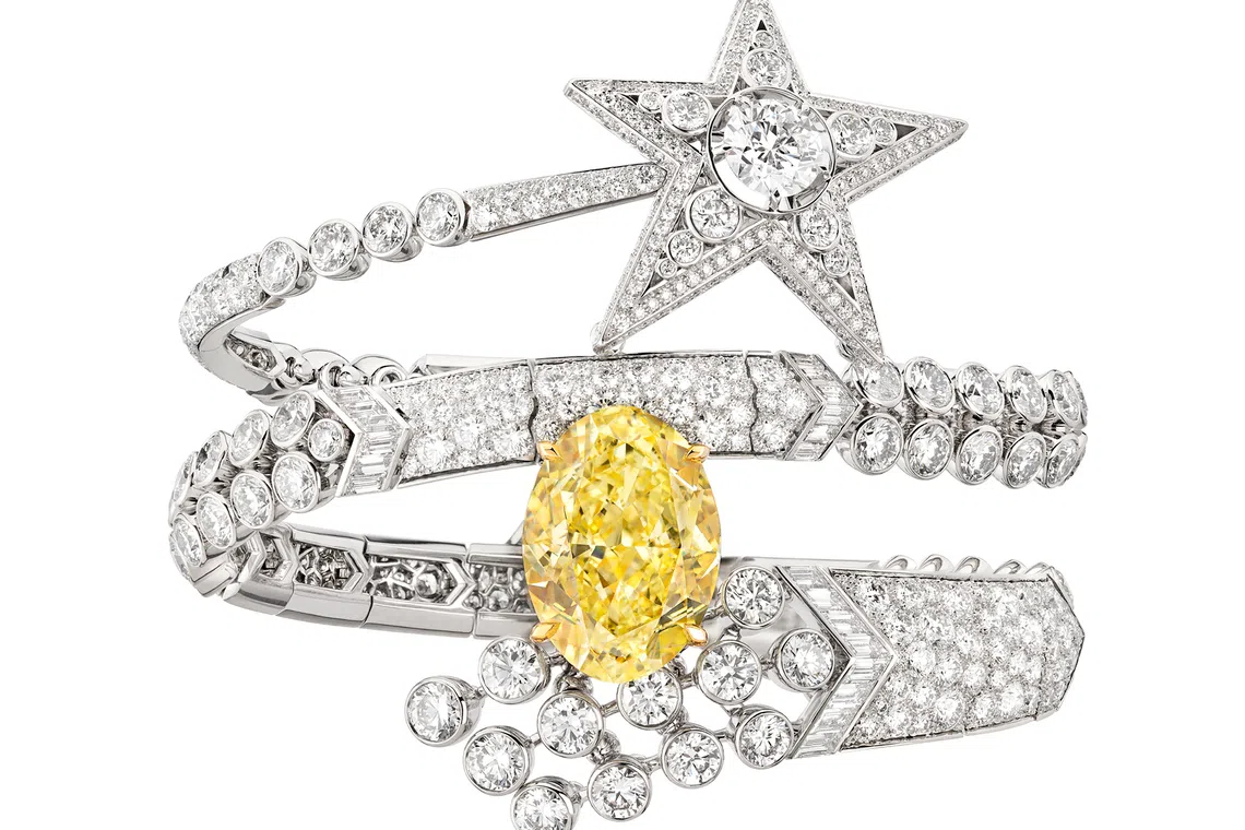 For the former, High Jewellery is the way to go. Chanel’s Comète Volute bracelet in white gold and diamonds is a signature piece from its 1932 collection, and plays on the celestial theme. The diamond-studded white gold tail of a shooting star, centred by a round-cut diamond, swirls around the wrist while carrying an oval-cut yellow diamond of almost 20 carats.