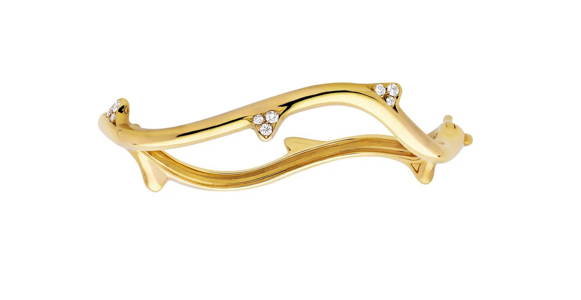Another sleek piece to consider is a simple but lovely design from Dior. A rose stem-inspired creation, the Bois de Rose bangle curves around the wrist, while thorns become gentle barbs of diamond-studded gold.