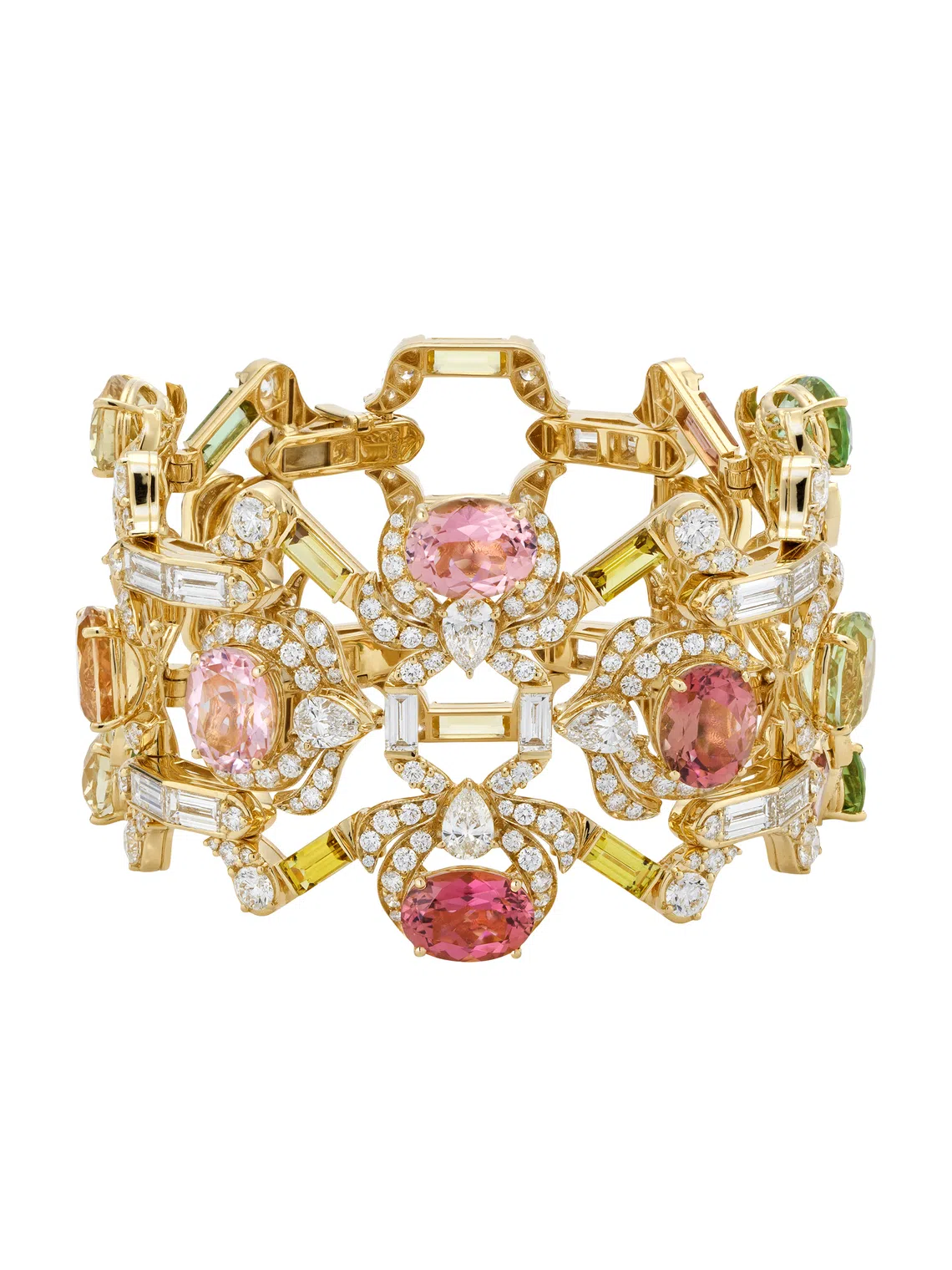 Another statement piece to consider comes from Gucci’s Allegoria High Jewellery collection. The yellow gold bracelet from its Autumn chapter is decorated with the warm hues of mandarin garnets, colourful sapphires and diamonds.