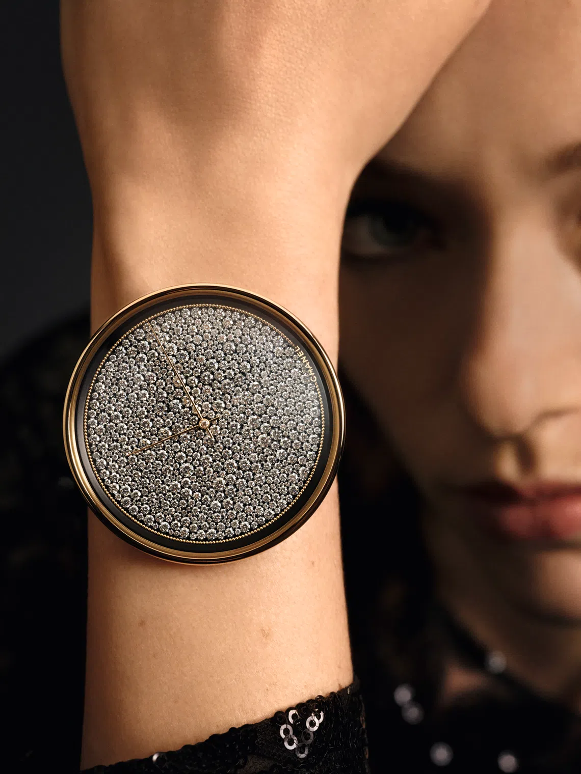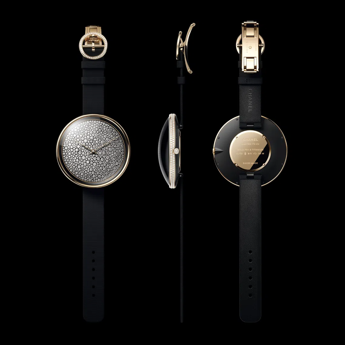 While its architecture is simple, the dial is oversized for presence and impact and set with 650 brilliant-cut diamonds surrounded by mini pearls of yellow gold. The case, crown and buckle are also set with diamonds, while a black matte grosgrain bracelet completes the watch. This piece stands out for its pure and distinctive design and size.