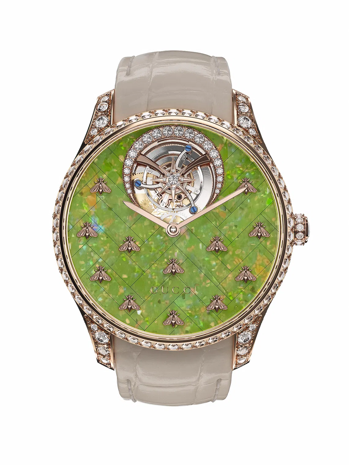 For something elegant yet slightly quirky, go for Gucci’s G-Timeless Dancing Bees, which celebrates, well, bees. In a pink gold case set with diamonds sits a vibrant green opal dial and 12 moving golden bees which flutter and shimmer with the slightest movement of the wrist. A star-studded tourbillon within a diamond-set crescent at 12 o’clock and an alligator strap complete this beautiful timepiece.