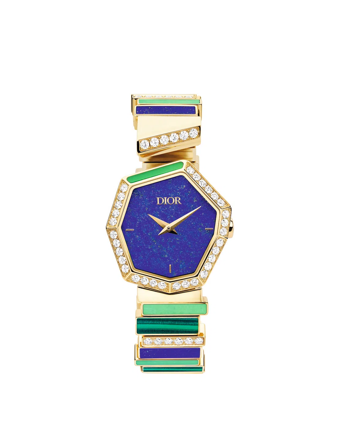 At Dior, a balance between refinement and simplicity is seen in its Gem Dior collection. Timepieces here play on graphic lines and organic abstraction arising from both a love of stones and of couture. Inspired by the colourful fabric swatches of Christian Dior’s couture collections, asymmetrically composed pieces of stones fit together like mineral strata. In one model, for instance, yellow gold is set with chrysoprase, lapis lazuli, malachite and diamonds.