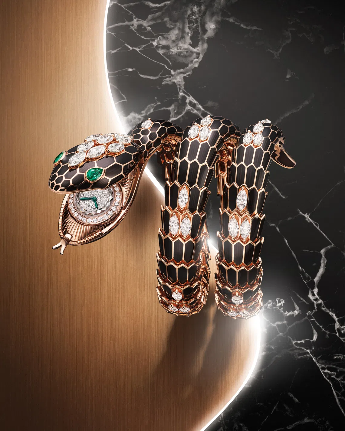 These include the Serpenti Tubogas Infinity, which boasts a new modular construction that allows gems to be set on the hallmark wraparound bracelet for the first time, as well as four showstopping secret watches that are powered by the Piccolissimo, a ground-breaking micro-calibre movement that is celebrated for its compact prowess.