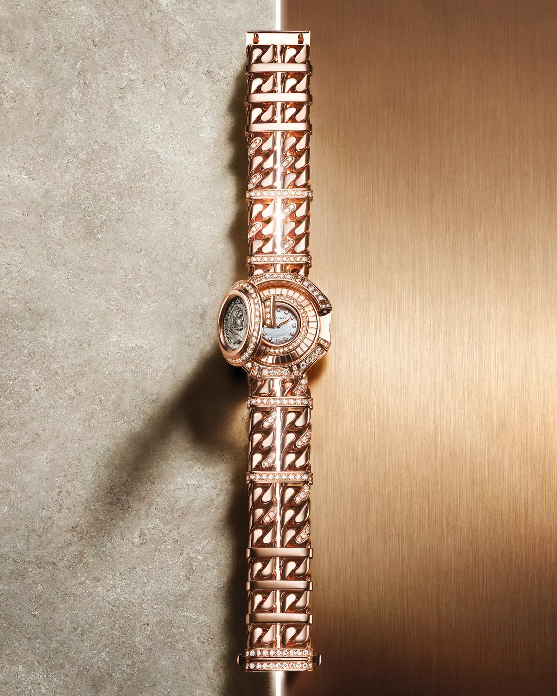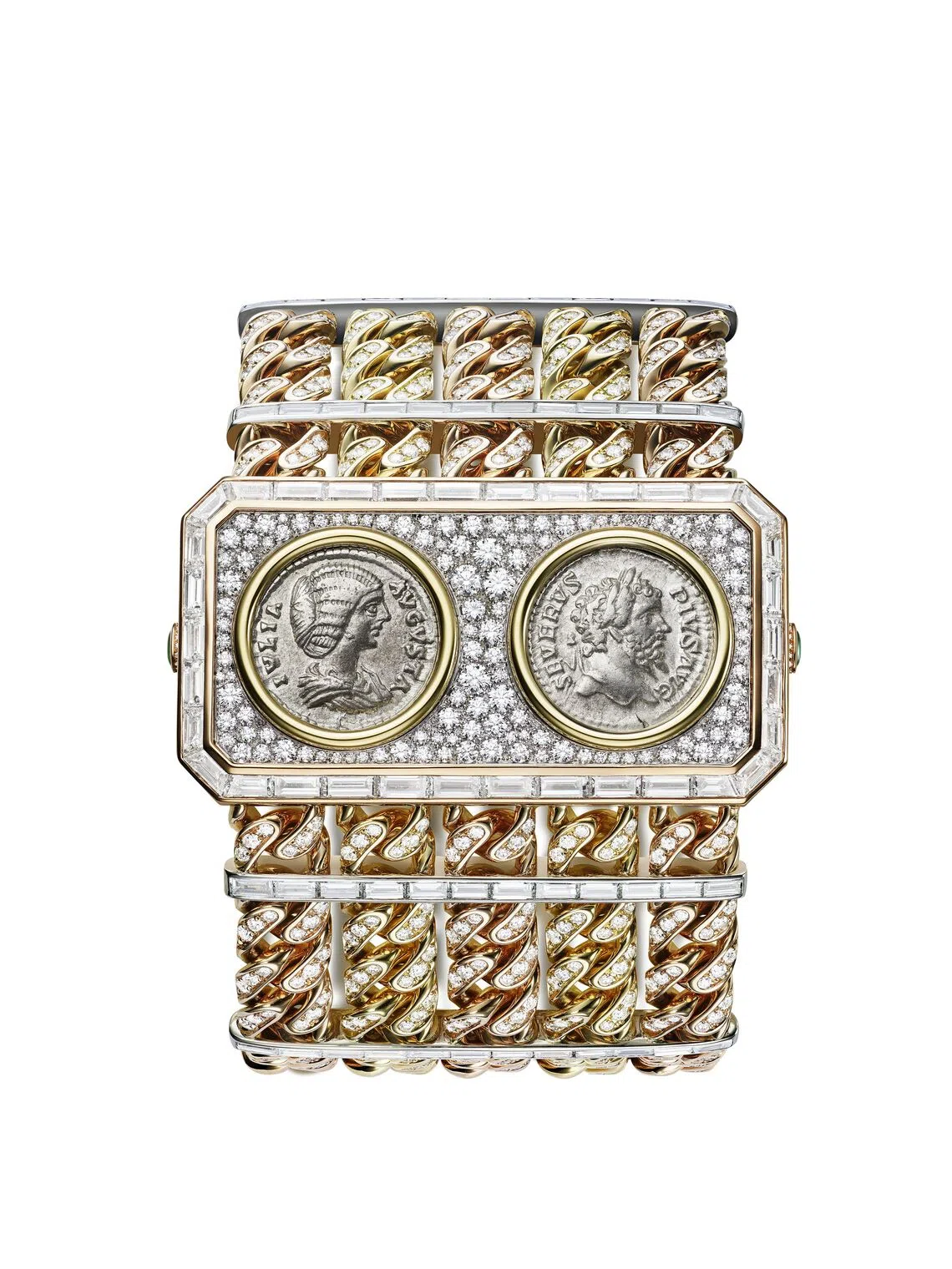 Monete Catene High Jewellery secret watches Discerning Bulgari aficionados will know that the house has been incorporating ancient Greek, Roman and Persian coins into its jewellery since the 1960s. Fusing history with artistry, these pieces were distinguished by supple, diamond-set gold chain bracelets reminiscent of curb chains (catene in Italian) from the 1940s. In keeping with this creative heritage, a pair of Monete Catene High Jewellery secret watches celebrating the jeweller’s Roman roots were launched in August at Geneva Watch Days.