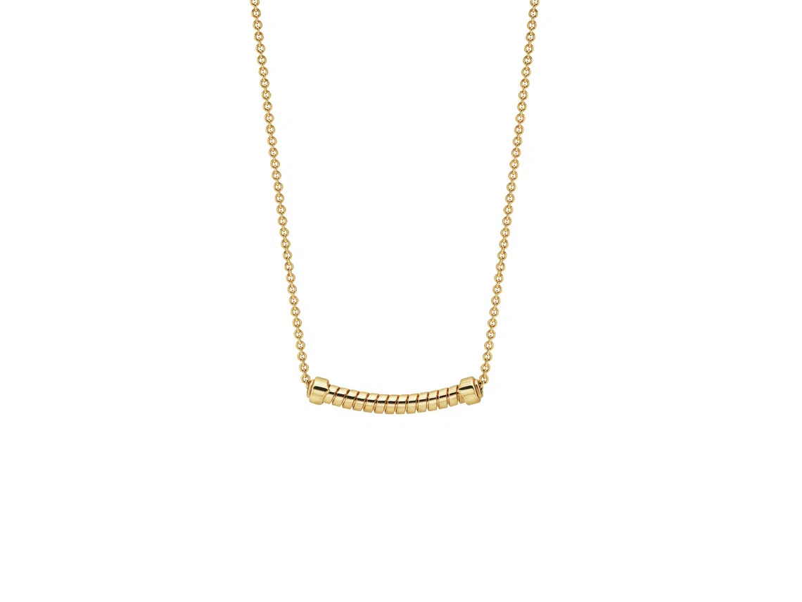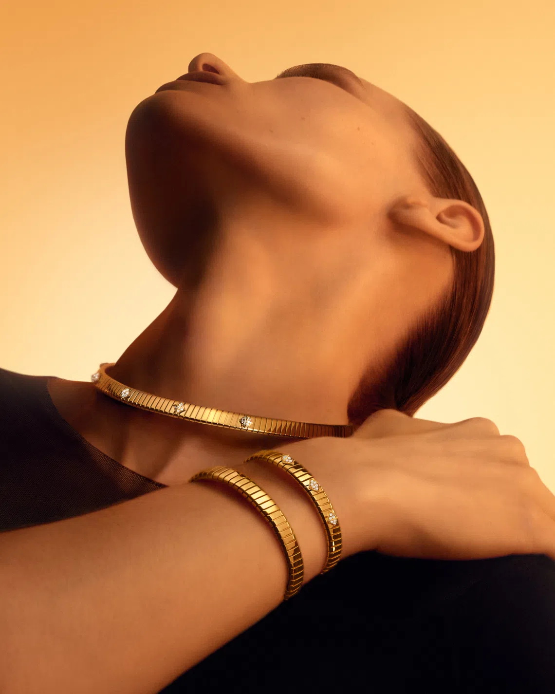 Similarly, there are necklaces that range from an understated, golden chain holding a central Tubogas element to supple chokers in shiny yellow gold or decorated with diamond studs.