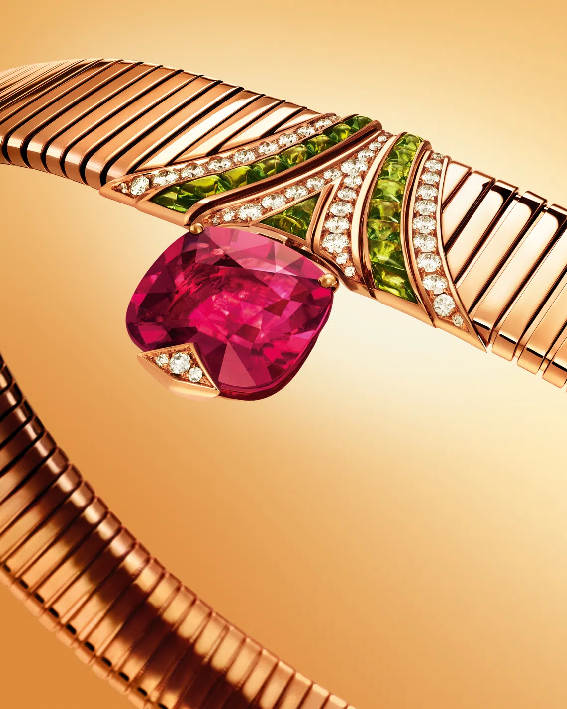 The piece de resistance, however, is a necklace in pink gold featuring a 16.89-carat cushion rubellite accompanied by buff-top green tourmalines and pave diamonds.