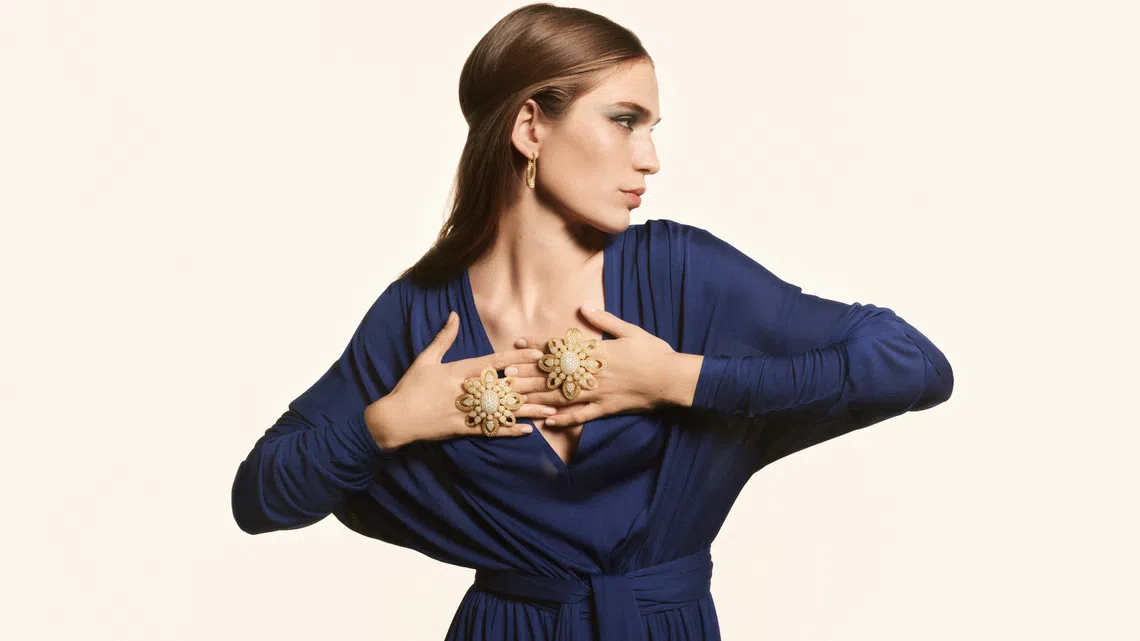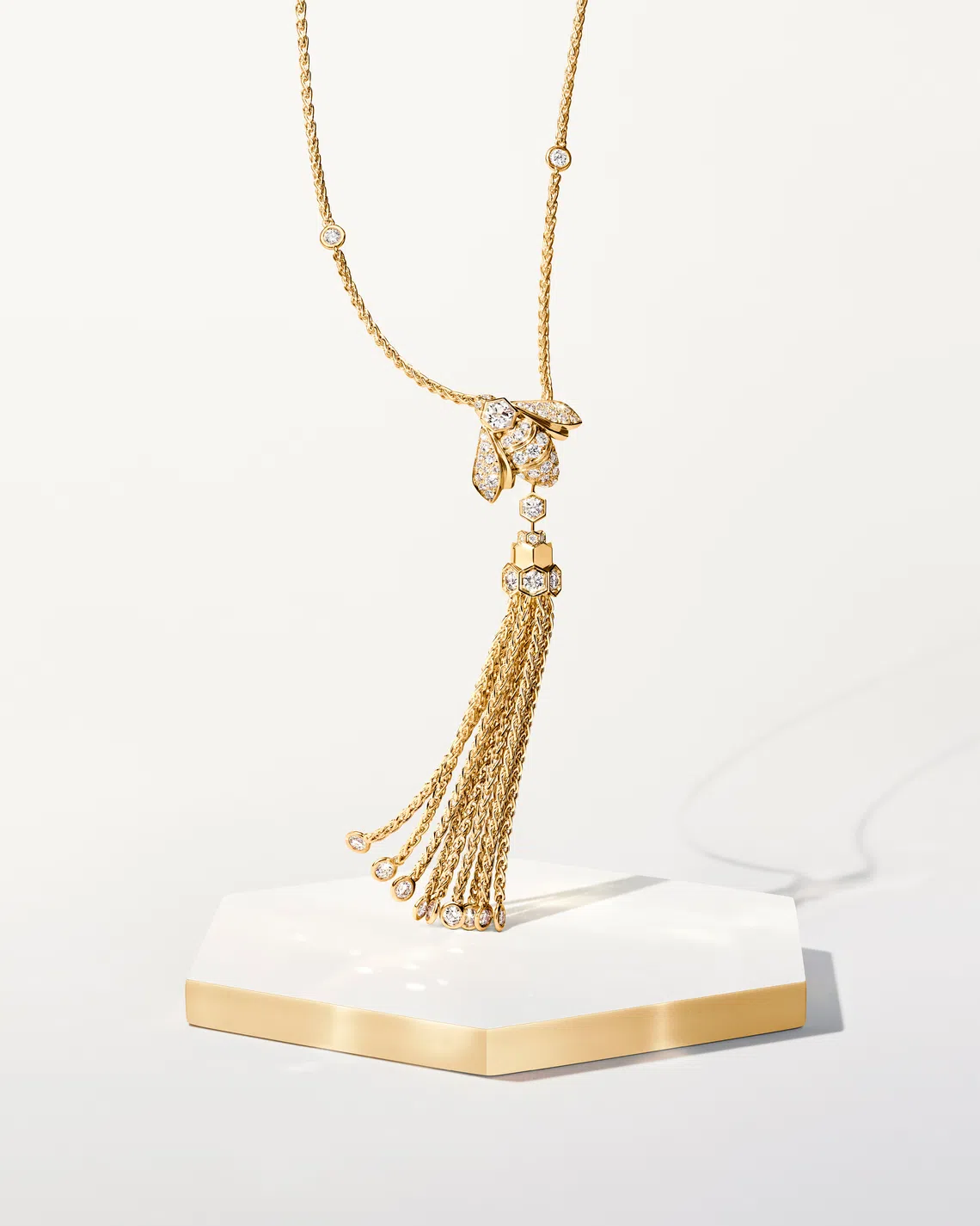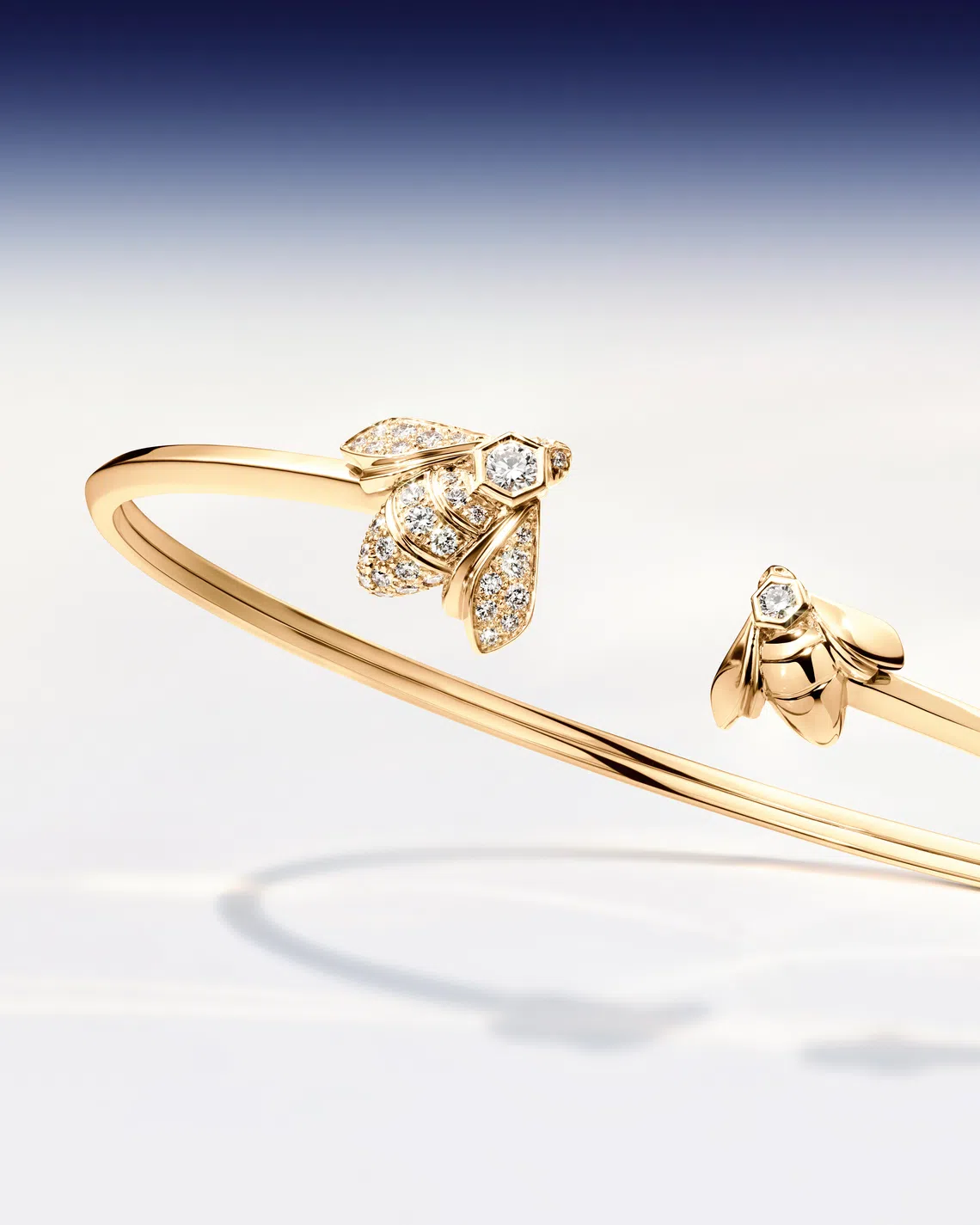 For 2025, its flagship bee and honeycomb motifs crafted in gold and diamonds now come in a dozen new iterations, including a yellow gold necklace and earrings featuring a pave diamond bee with gold tassels. Another pretty piece is a flexible, openwork yellow gold bangle dressed with a diamond-studded bee at each end.