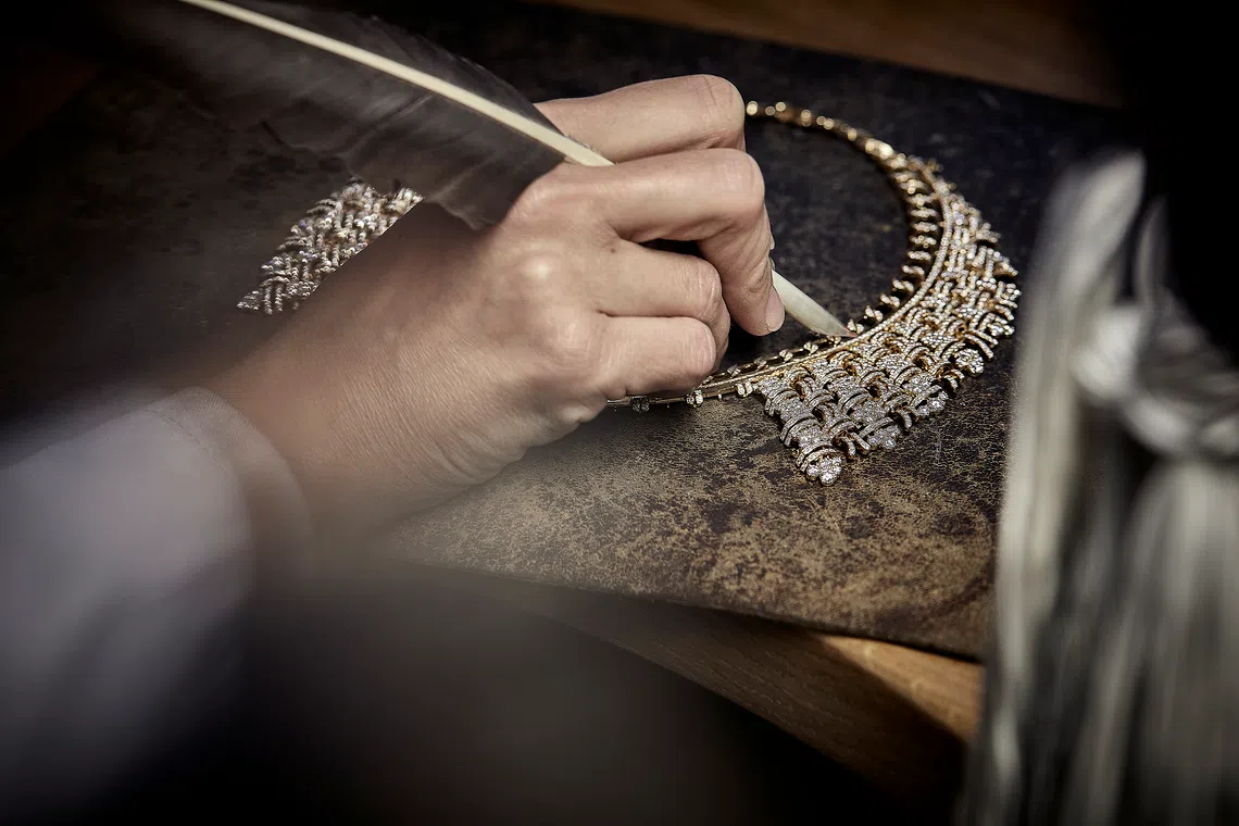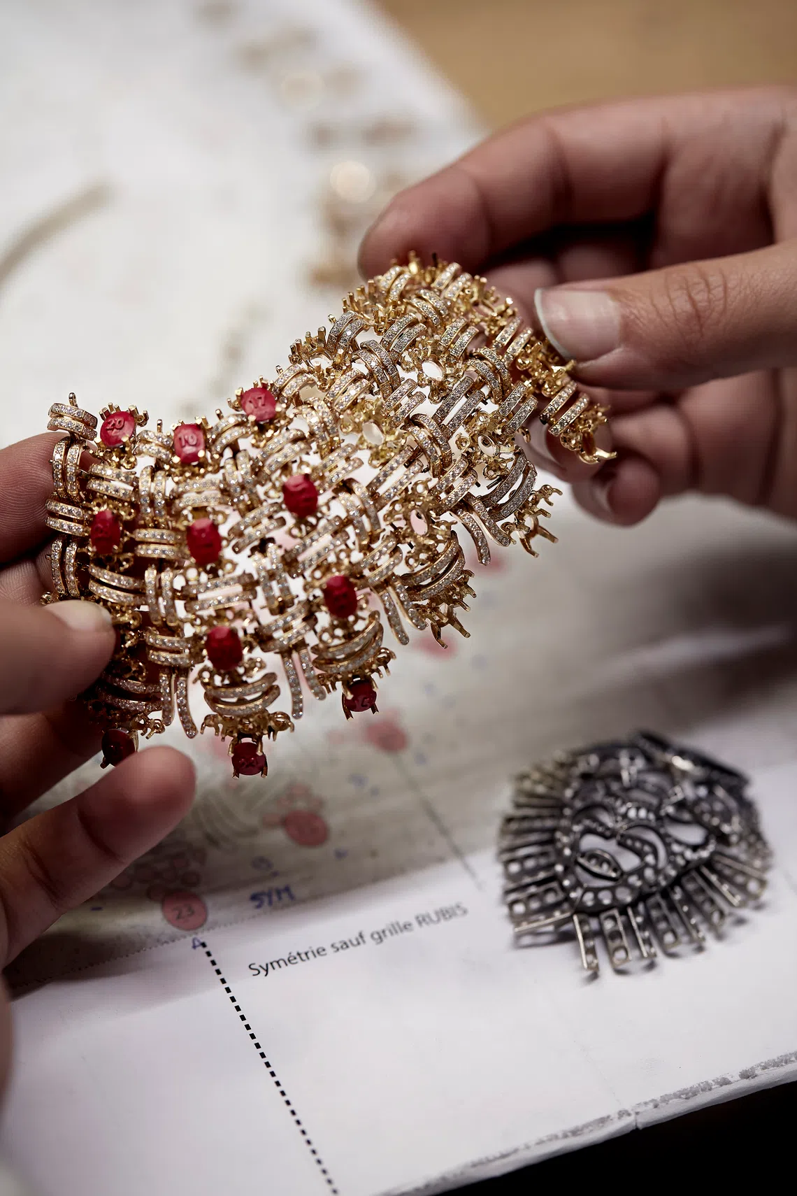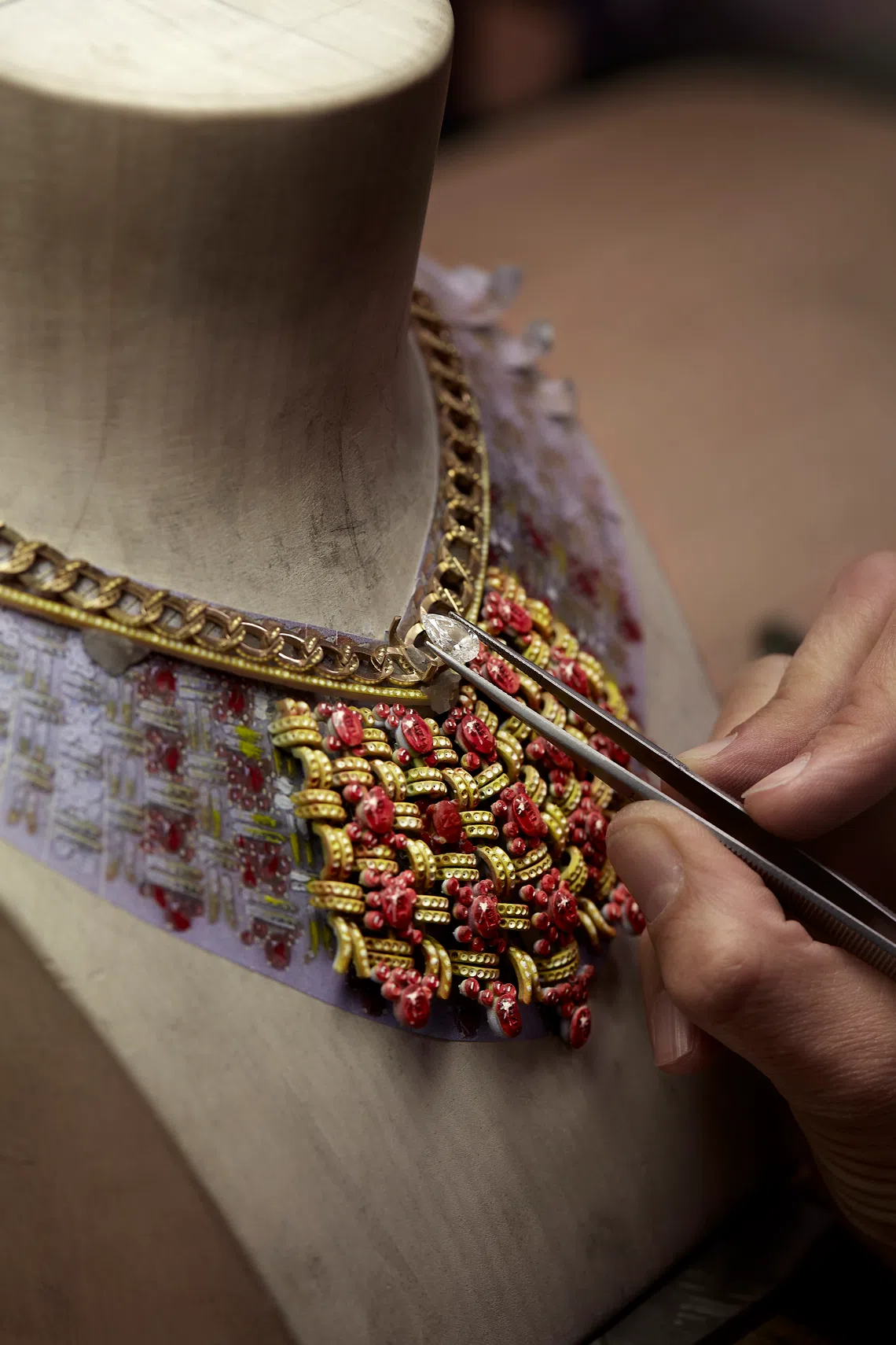 As Leguéreau puts it: “You can’t imagine the ingenuity and inventiveness deployed by the craftspeople in our workshops in reproducing the flexibility and fluidity of the fabric using metal and precious stones!”