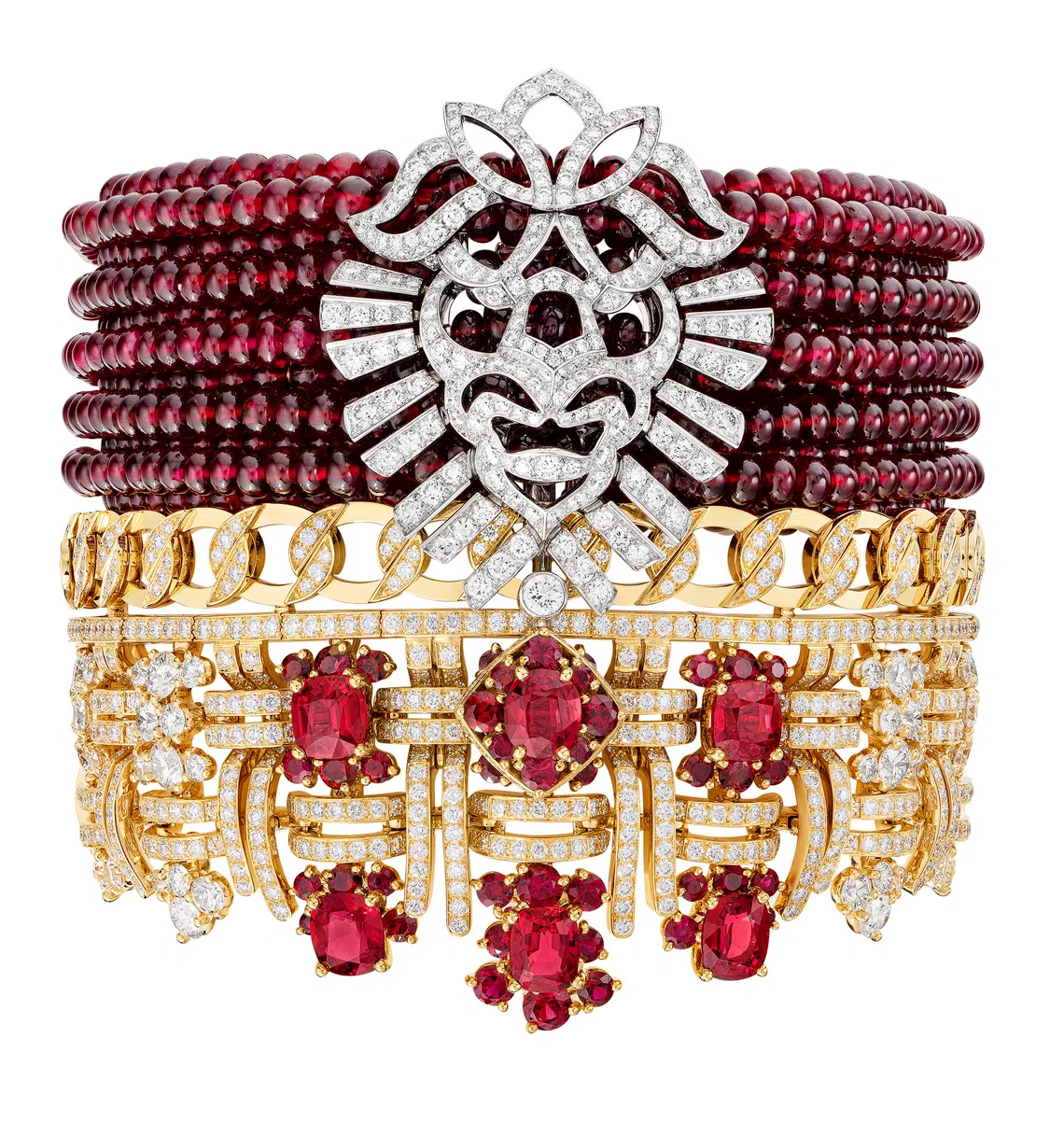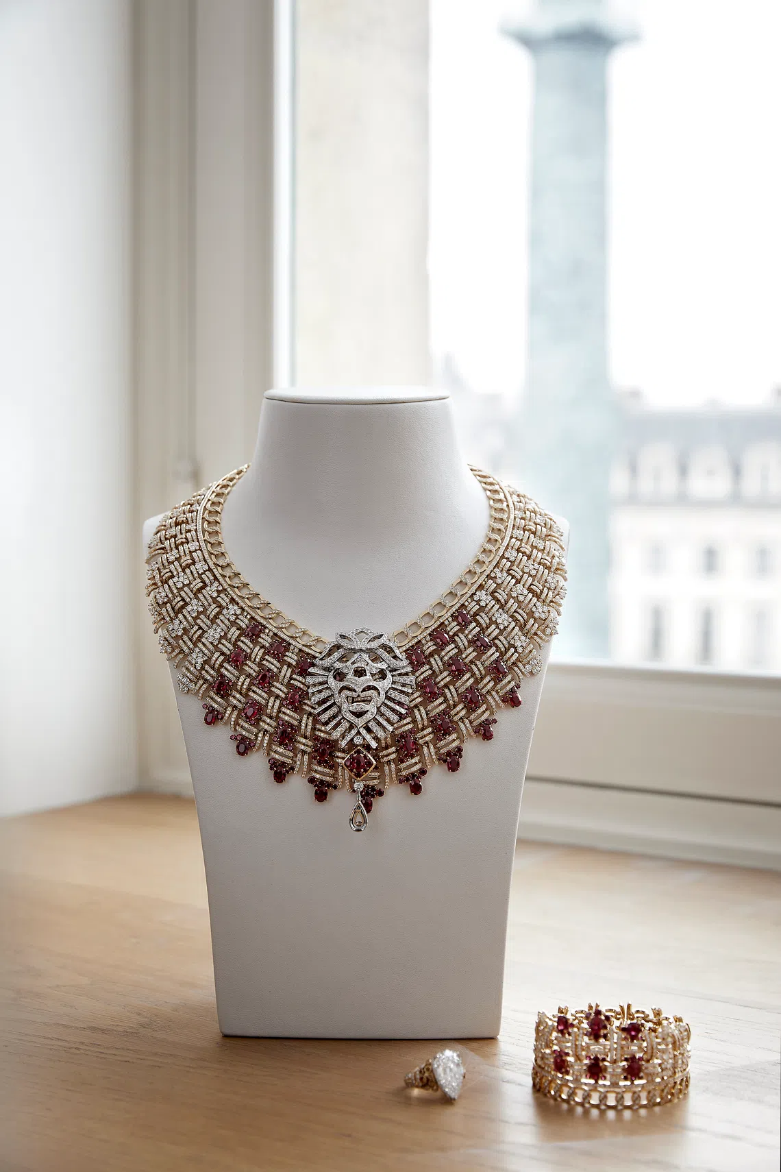 The star of the set is the intricately crafted plastron necklace that is trimmed with a chain, its yellow gold weave set with diamonds and a magnificent ensemble of rubies. The diamond lion’s head at its centre can be detached to be worn as a brooch, while the magnificent pear-cut diamond hanging just below it, can also be removed and worn as a ring.