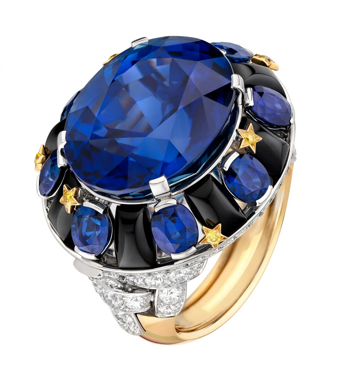 The third symbol, the Star, is an emblem of Bijoux de Diamants, the first and only High Jewellery collection created by Mademoiselle Chanel in 1932. Here, the depths of the starry night sky is “an exploration of blue in all its shades, from onyx to sapphire to lapis lazuli, with small stars scattered through the tweed like embroideries”, describes Leguéreau.
