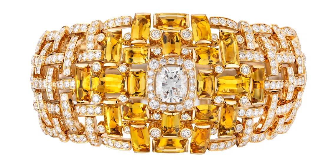 The Sun on the other hand, is radiant, its beams translating into a glittering tweed that alternates large volumes and plays on transparency. In a dazzling evocation of Byzantine and Venetian magnificence, the pieces are bolder and more opulent, with a multitude of yellow stones set in a weave of gold.